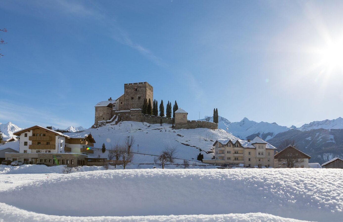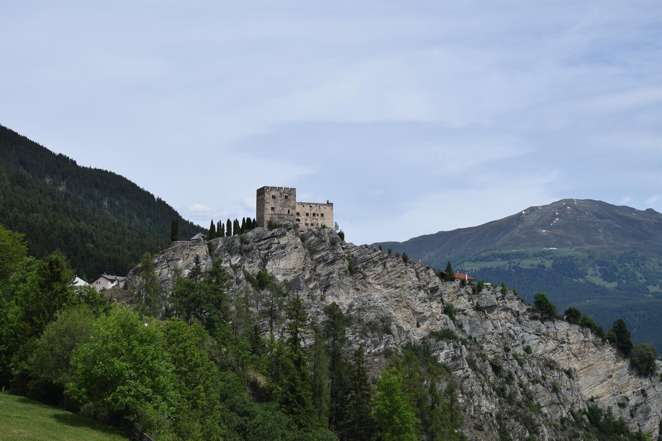 Der Burghügel an der nördlichen und westlichen Bergseite fällt mäßig steil zum Weiher (Schlossteich) und zum Dorf Ladis ab.