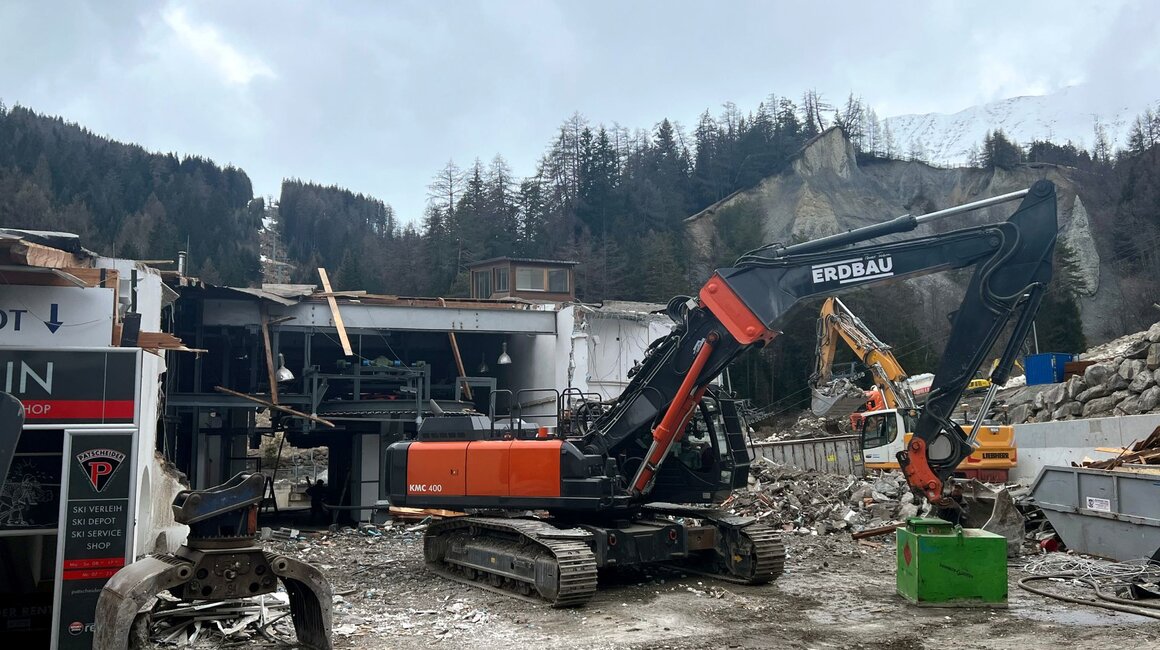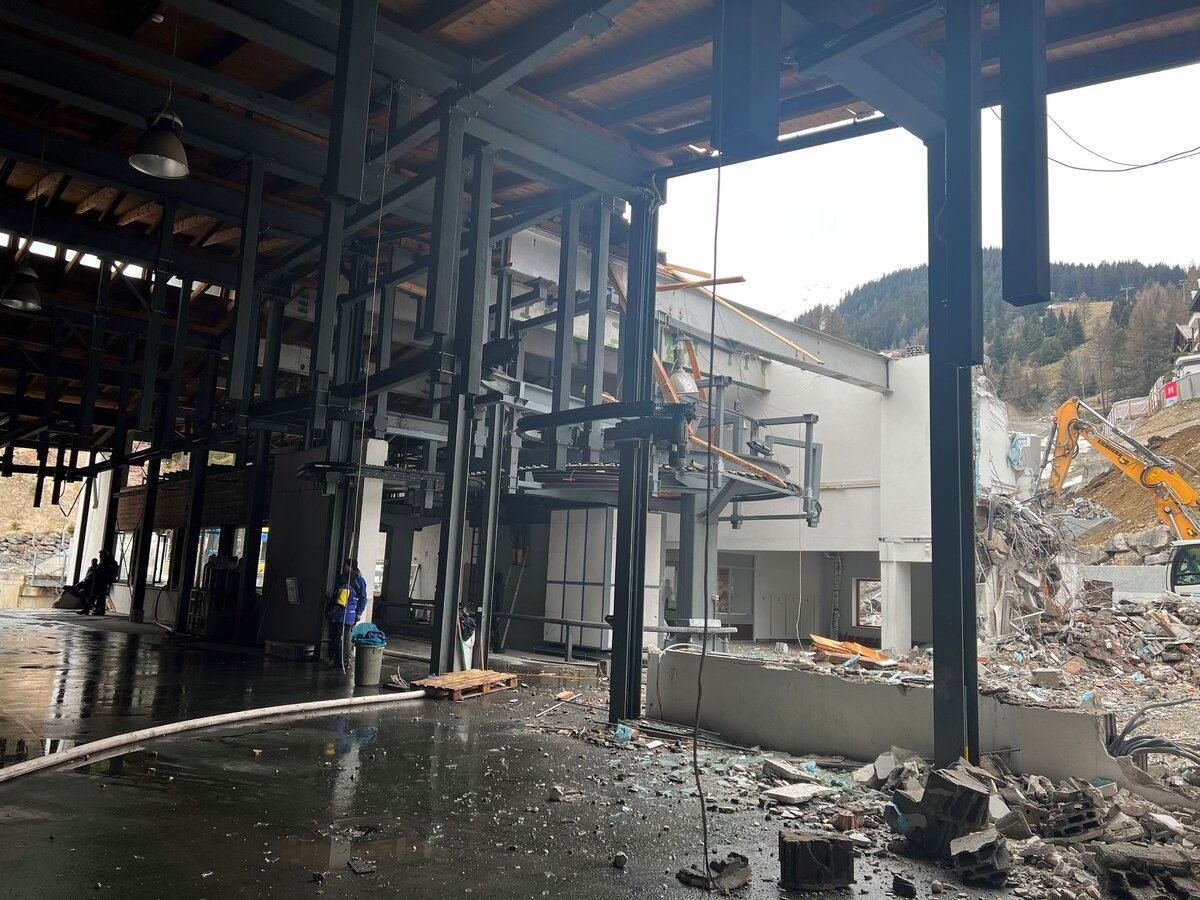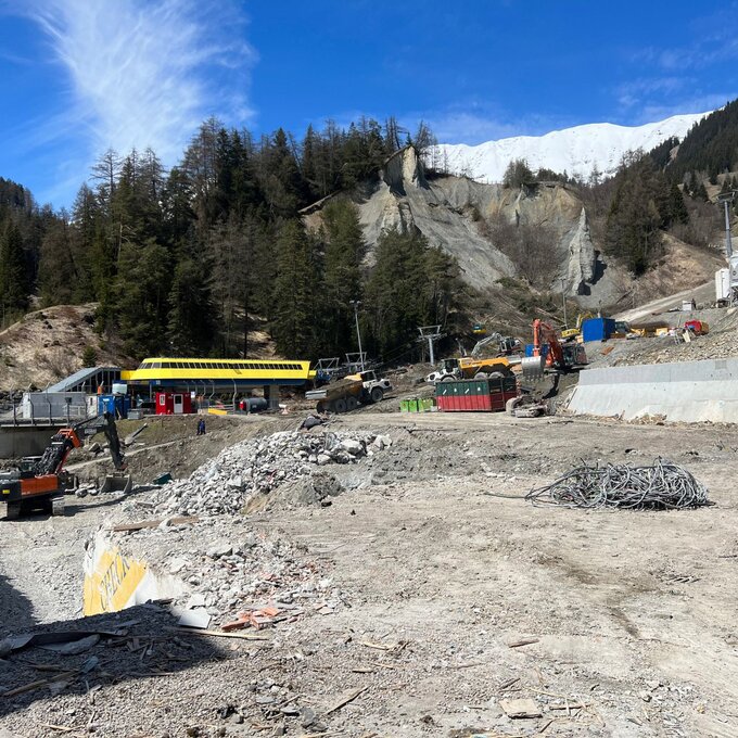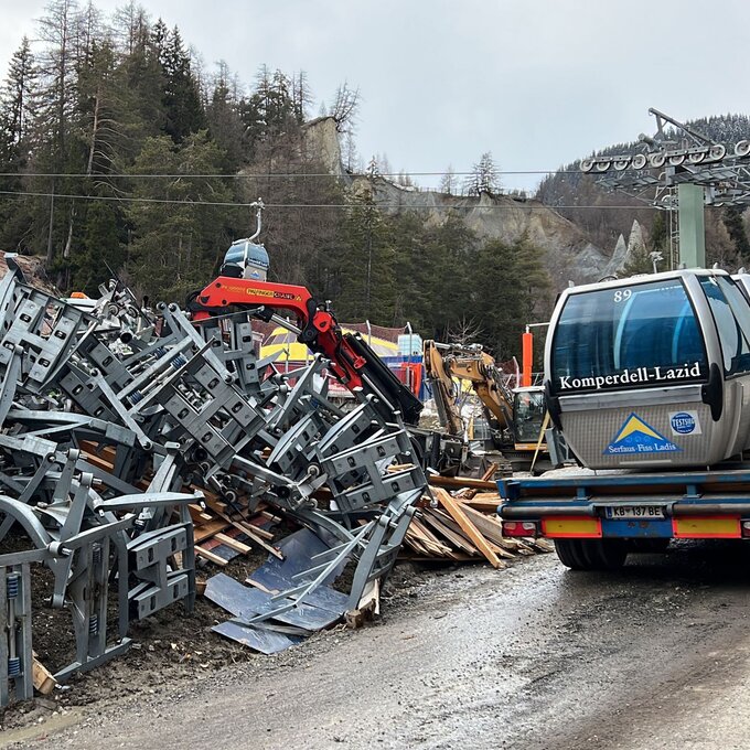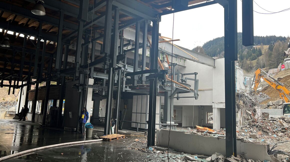 Gleichzeitig wird natürlich an der Berg- sowie der Zwischenstation fleißig gearbeitet. Die Abbrucharbeiten im Bereich des Skischulbüros am Komperdell sind großteils abgeschlossen, an der Zwischenstation hat die Firma Doppelmayr bereits mit der Montage begonnen.