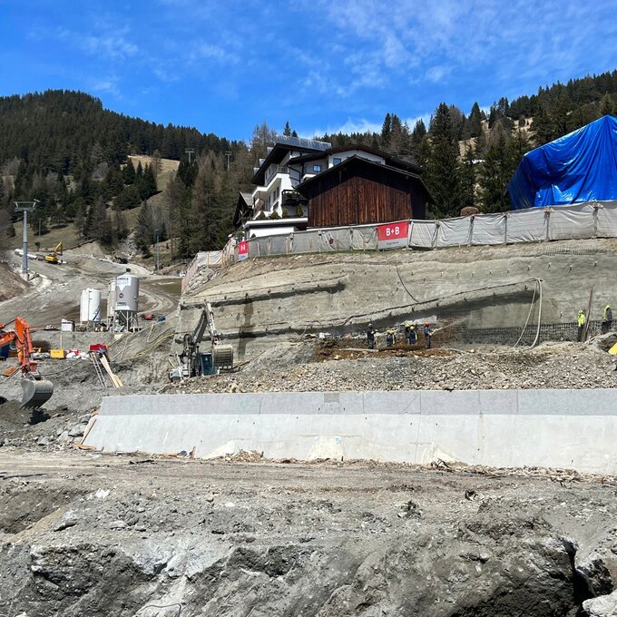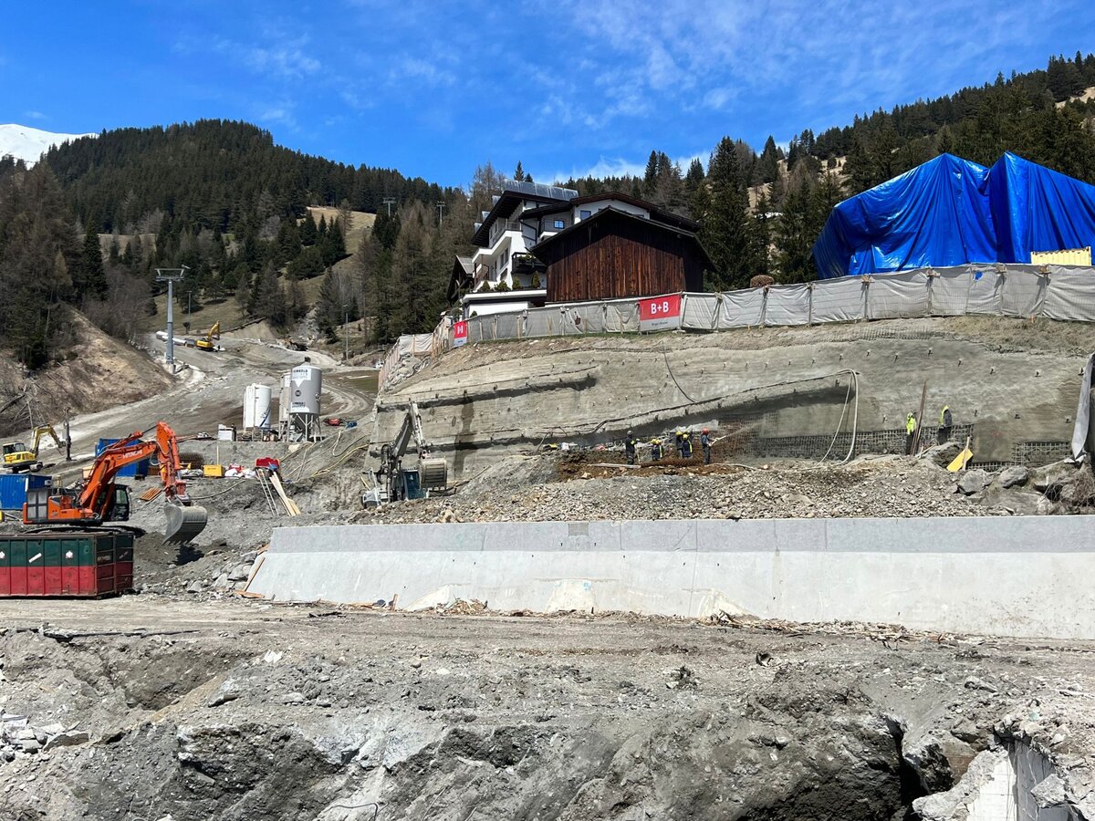 Das neue Talstationsgebäude der Komperdellbahn kommt etwas versetzt in den Hang, um eine größere Freifläche zu gewinnen. Somit ist der gesamte Bereich wesentlich weitläufiger und man hat von der U-Bahn kommend sofort einen Blick auf alle drei Bahnen, die ins Ski- bzw. Wandergebiet führen. Auch hier finden derzeit die Aushubarbeiten statt, notwendige Hangsicherungen schreiten zügig voran. Bis Mitte Mai sollten alle Aushub- und Sicherungsarbeiten abgeschlossen sein, damit die Betonarbeiten starten können.