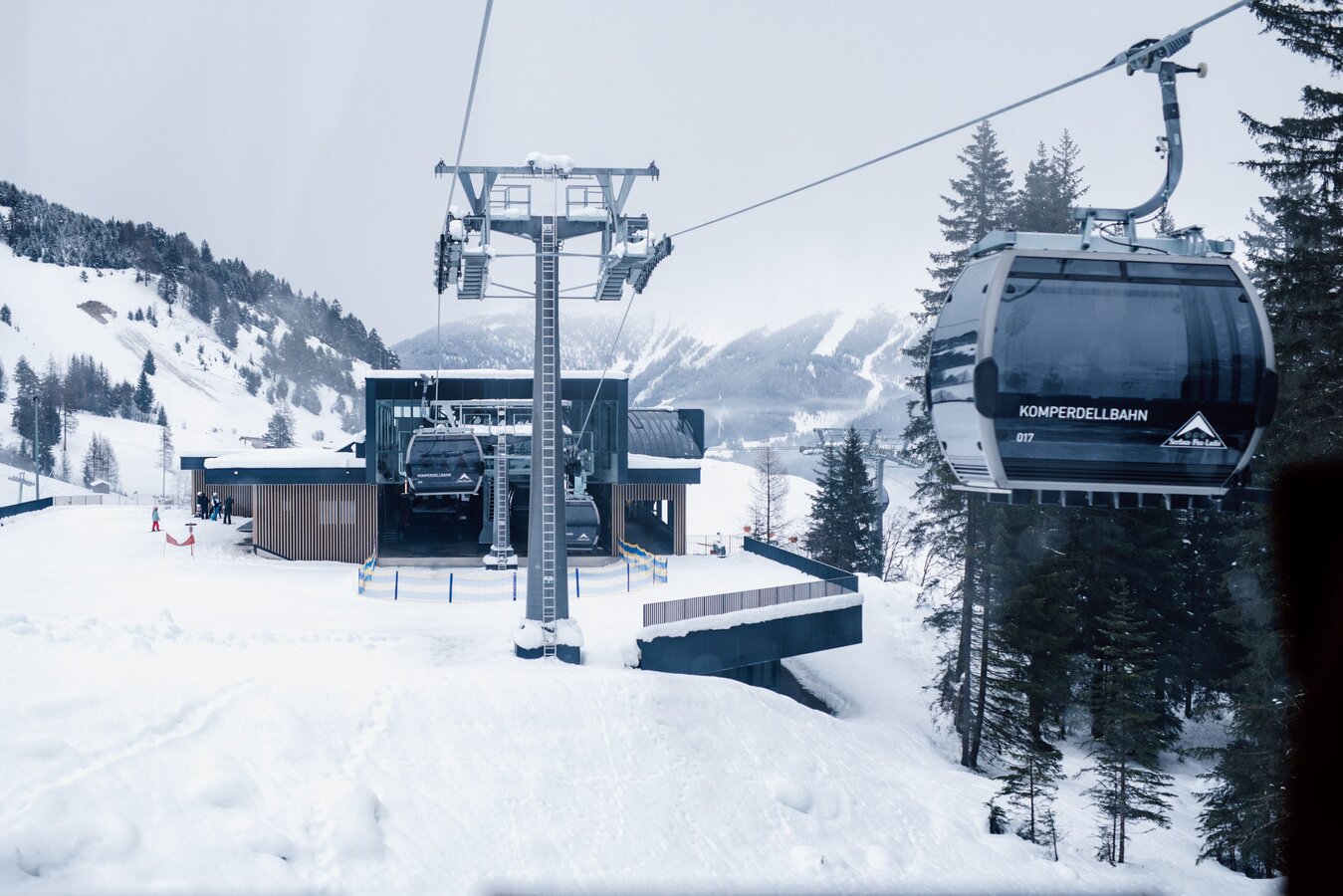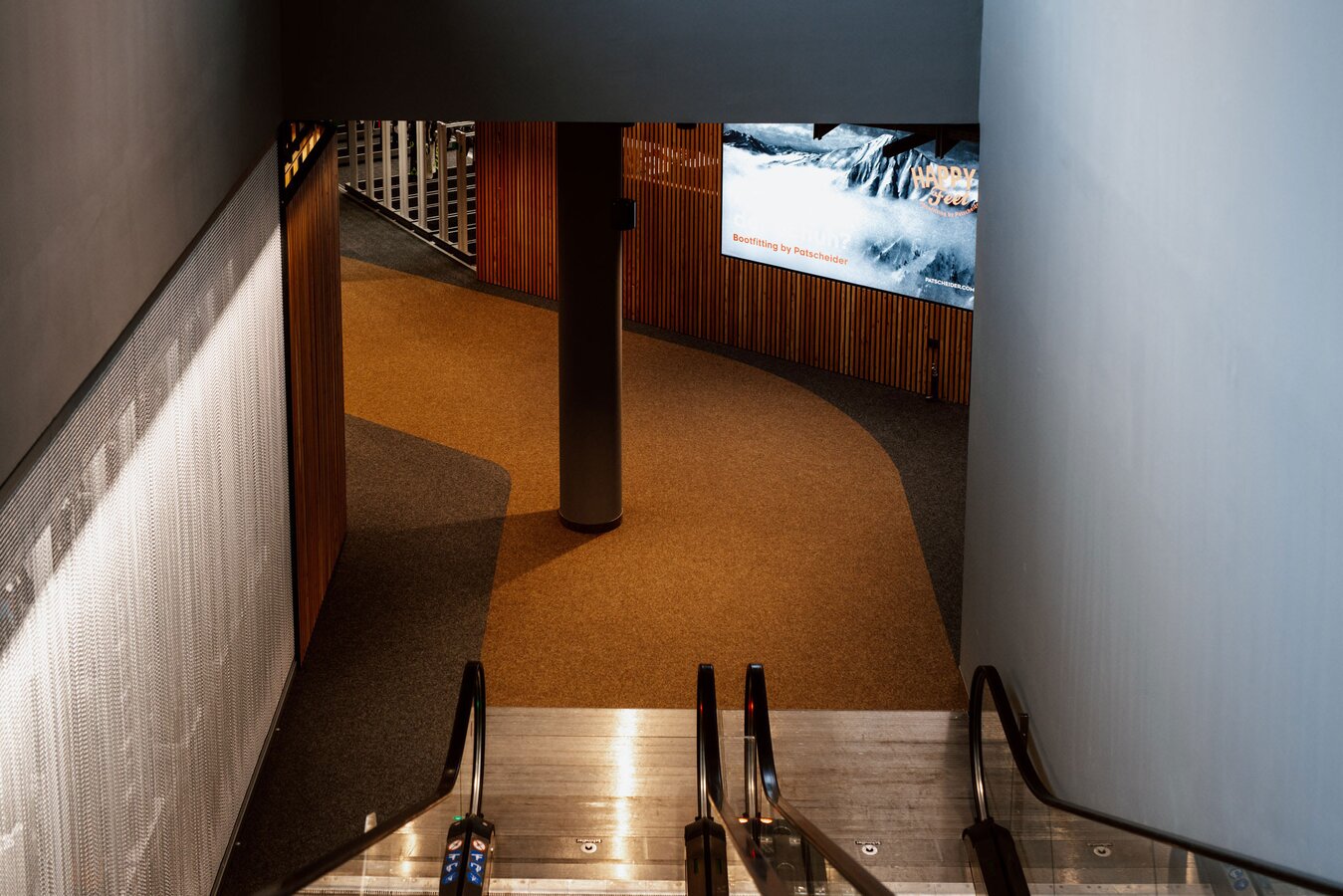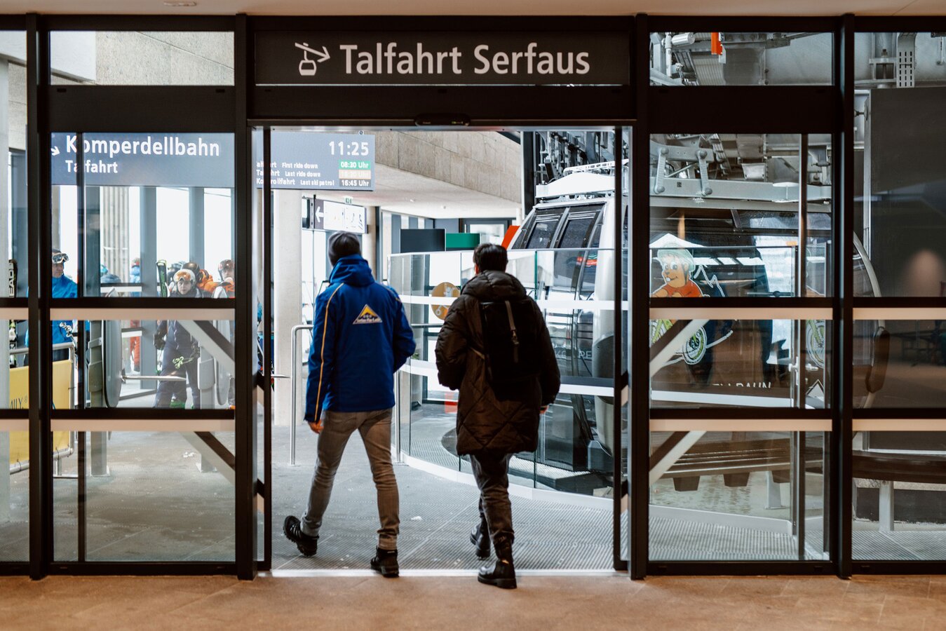 Schon am neuen Vorplatz, zwischen Alpkopfbahn und Komperdellbahn, zeigt sich, dass sich der große Umbau gelohnt hat: Es gibt jetzt viel mehr Platz für ankommende Skifahrer. „Dadurch, dass die Talstation in den Hang hinein gebaut wurde, wirkt der ganze Platz viel weitläufiger.“ Das wahre Raumwunder verbirgt sich aber unter der Erde – und deshalb geht es per Rolltreppe erst einmal eine Etage nach unten, bevor die neue Komperdellbahn uns bequem Richtung Berg befördert.