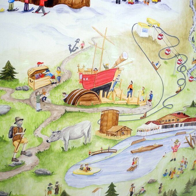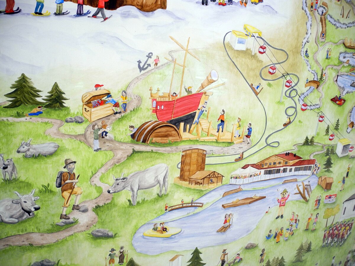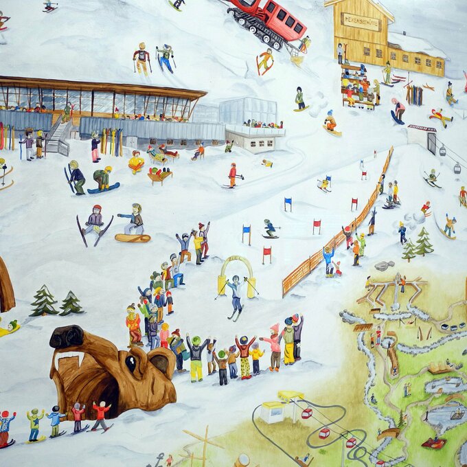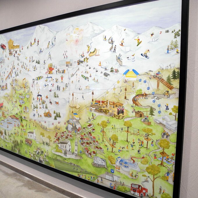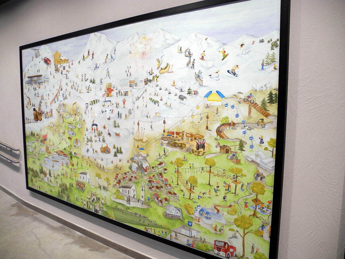 Natürlich kommen auch die jungen Fahrgäste ganz auf ihre Kosten. Ein handgemaltes Wimmelbild spiegelt auf kindliche Weise das Vereinsleben und das allgemeine Dorfleben von Serfaus wider. Durch Ausschnitte auf den beleuchteten Flächen im Tunnel werden die Kids zusätzlich animiert, Ausschnitte im großen Bild zu finden. Eine Holz-Drehfigur sowie vier lebensgroße Lentikularbilder (auch Linsenrasterbild oder ganz einfach Wackelbild genannt) sorgen für zusätzlichen Spaß in der Station Zentrum. Aber Achtung: Nicht dass man vor lauter Ablenkung die Bahn versäumt…