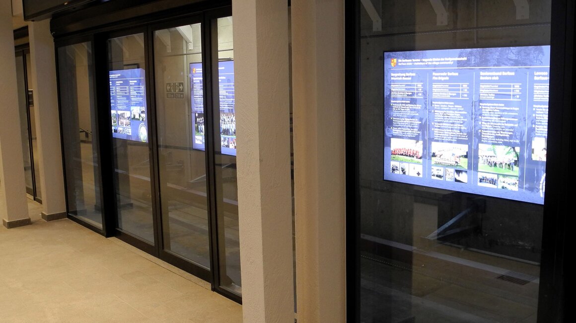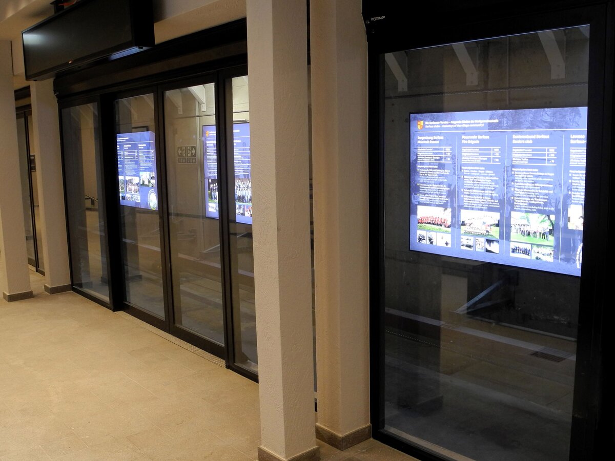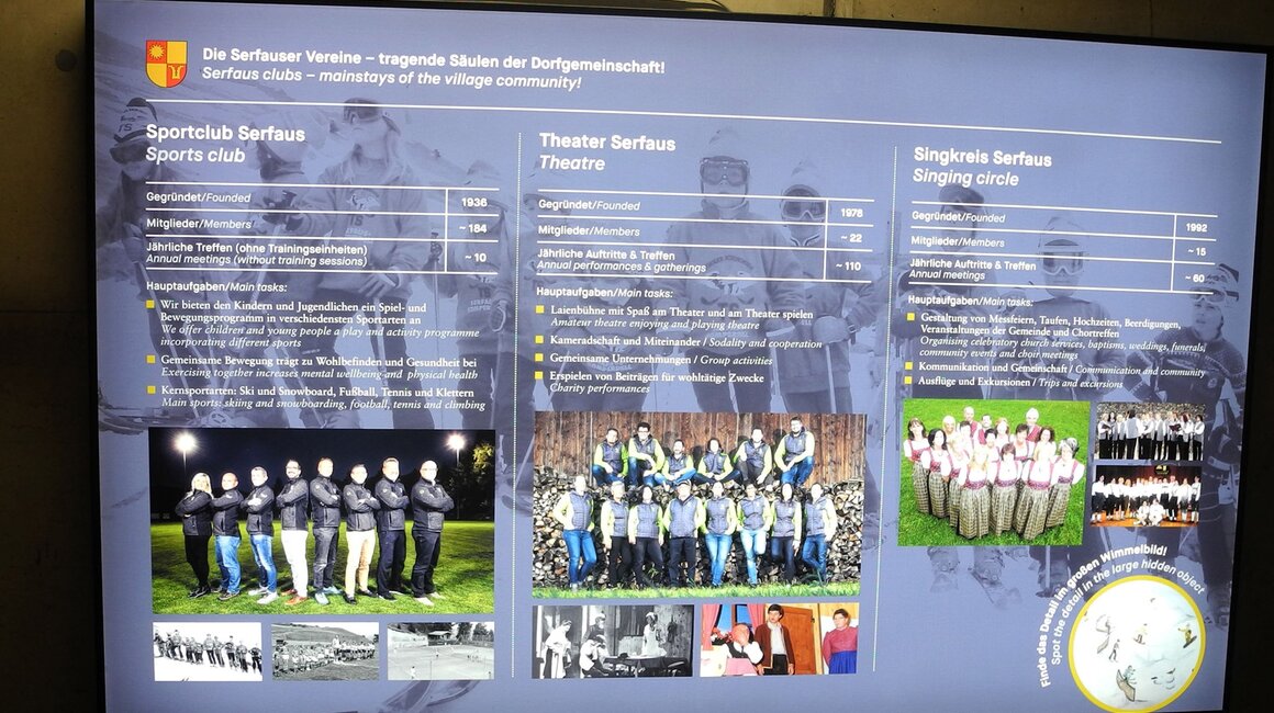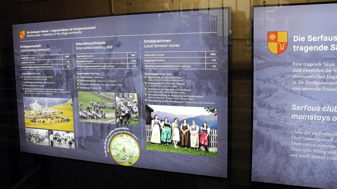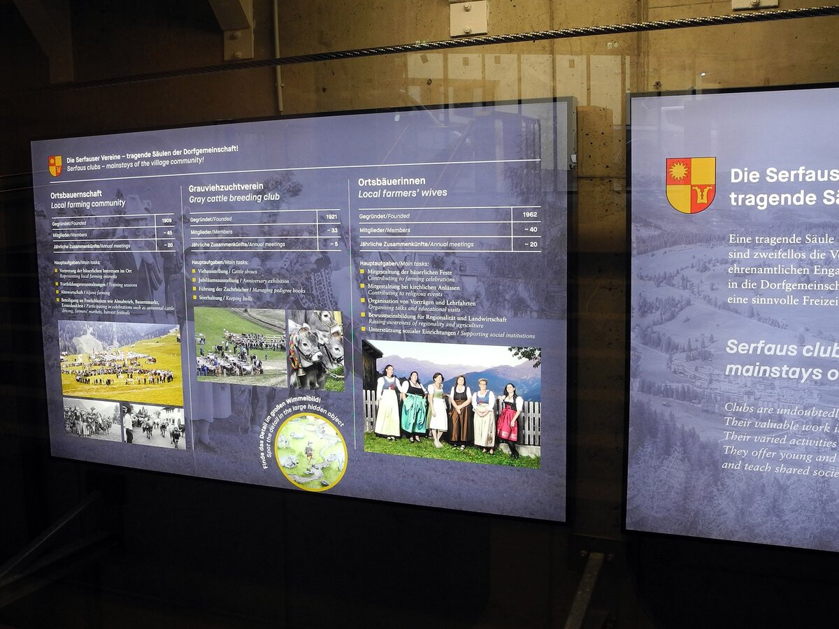 Wie bereits angekündigt, findet man auch in der Station Zentrum tolle Inszenierungen vor. „Die Serfauser Vereine – tragende Säulen der Dorfgemeinschaft“, lautet das übergeordnete Thema. Sämtliche Serfauser Vereine werden sowohl bildlich als auch textlich informativ auf verschiedene Art und Weise dargestellt. Nicht zu übersehen sind die sechs großen Leuchtkästen, die im Tunnel angebracht sind. Um die Wartezeit angenehm zu verkürzen, wurden diese Informationsflächen installiert, wobei man neben tollen Bildern (von früher und heute) auch einen Einblick in die wichtigsten Tätigkeitsbereiche der einzelnen Vereine bekommt. Selbstverständlich findet man auch Daten zum Gründungsjahr, Infos über Mitgliederzahlen und jährliche Zusammenkünfte.