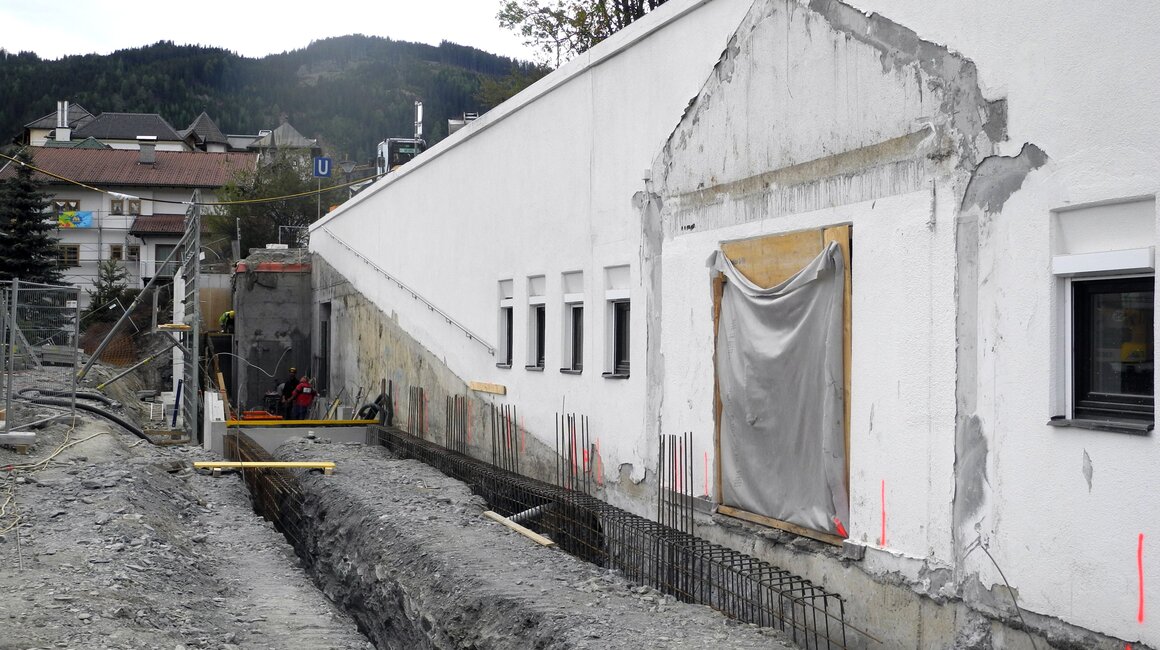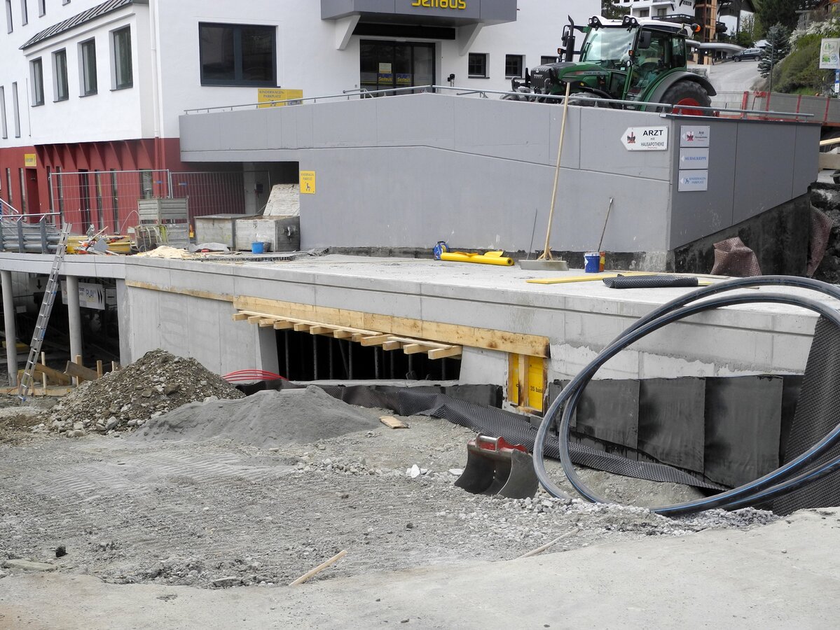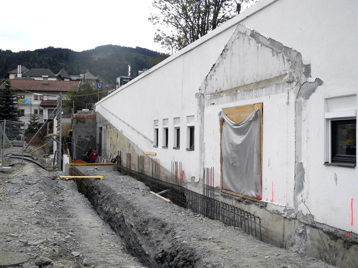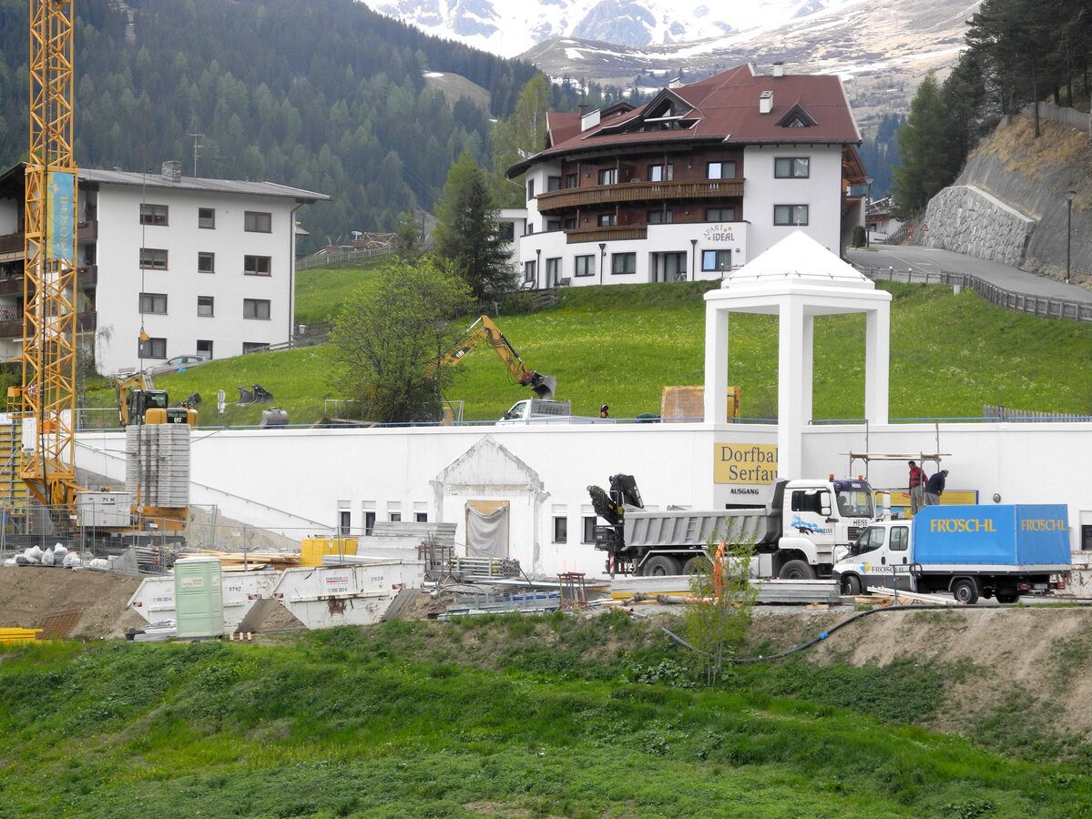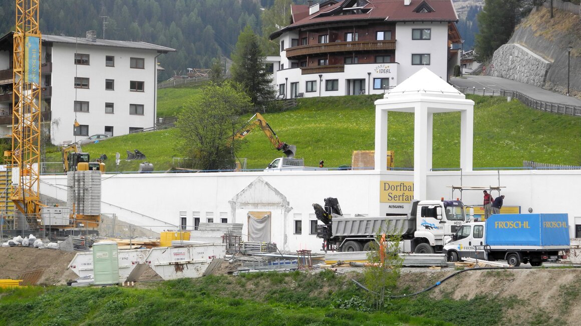 Gleich am Ortseingang ist unschwer zu erkennen, dass an der U-Bahn Serfaus gebaut wird – ein großer Kran deutet die Baustelle unterhalb der Dorfbahnstrasse an. Aber auch entlang der Dorfeinfahrt wird gegraben – Kanal, Wasser- und Mittelspannungsleitungen müssen nämlich in diesem Bereich aufgrund der Umbauarbeiten verlegt werden. Die Aushubarbeiten für den Zubau auf der Südseite sind bereits abgeschlossen – so wie auch die Betonschneidearbeiten zur Erweiterung der Technikräume und der Lüftung. Der westliche Teil der Bodenplatte, sowie zwei Wandsektionen sind fertig betoniert.