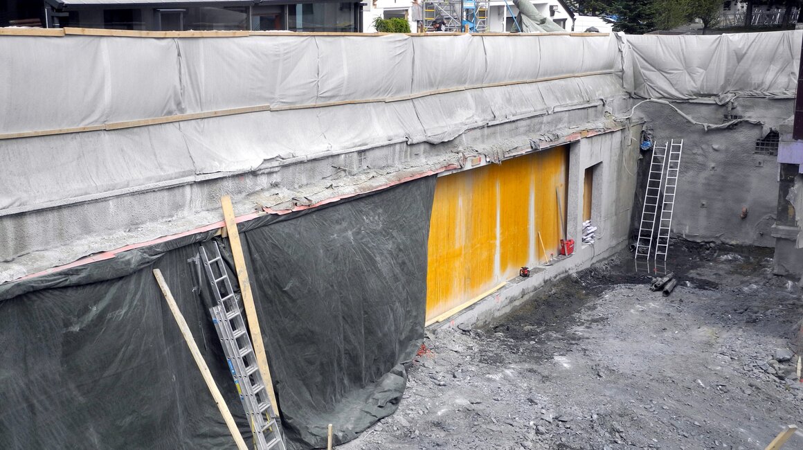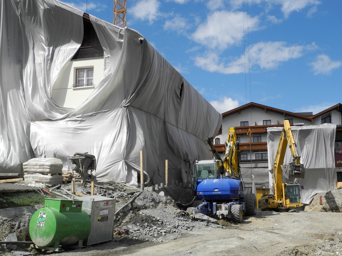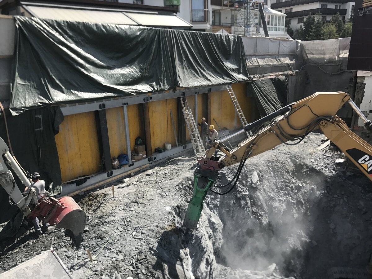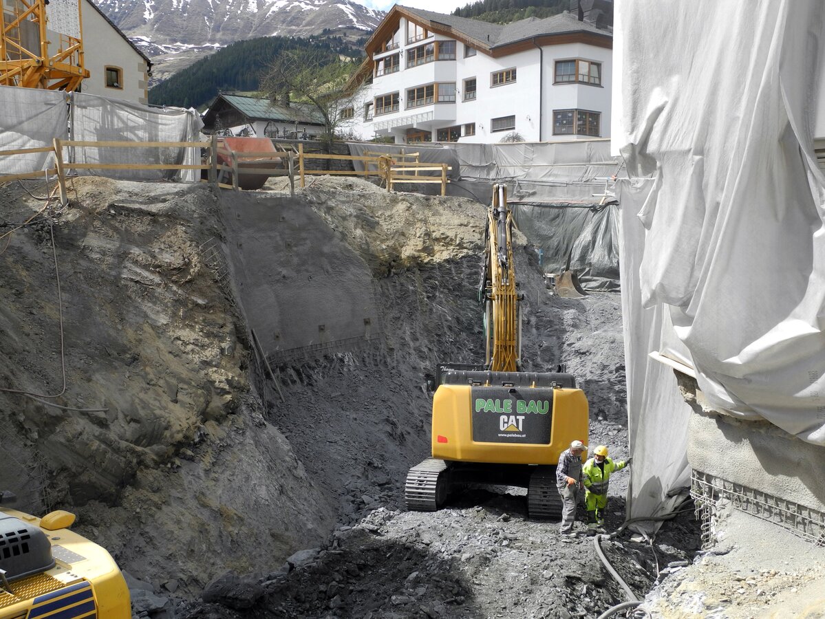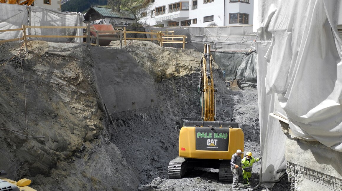 Gleich am Ortseingang ist unschwer zu erkennen, dass an der U-Bahn Serfaus gebaut wird – ein großer Kran deutet die Baustelle unterhalb der Dorfbahnstrasse an. Aber auch entlang der Dorfeinfahrt wird gegraben – Kanal, Wasser- und Mittelspannungsleitungen müssen nämlich in diesem Bereich aufgrund der Umbauarbeiten verlegt werden. Die Aushubarbeiten für den Zubau auf der Südseite sind bereits abgeschlossen – so wie auch die Betonschneidearbeiten zur Erweiterung der Technikräume und der Lüftung. Der westliche Teil der Bodenplatte, sowie zwei Wandsektionen sind fertig betoniert.