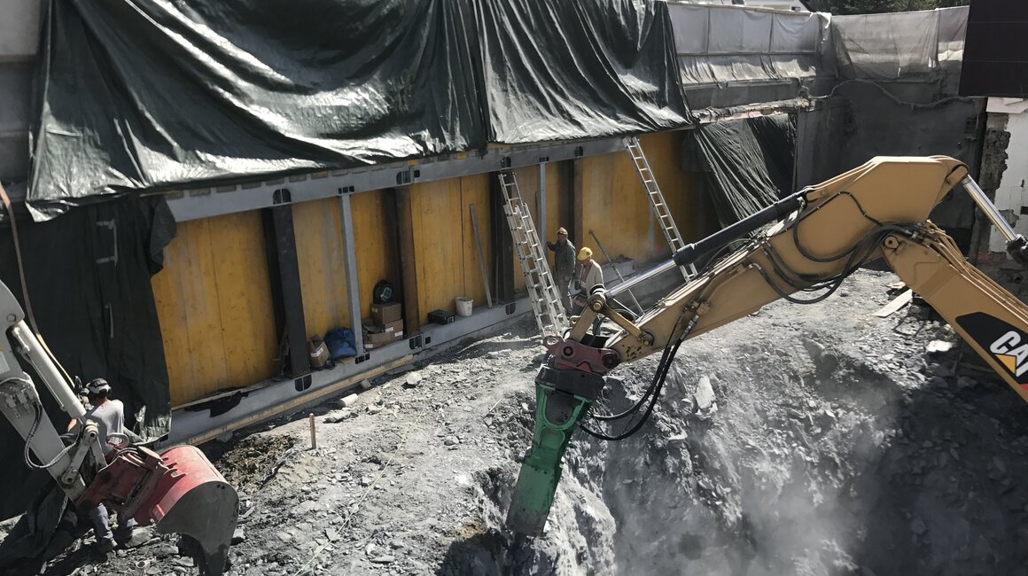 Die größte Baustelle befindet sich erwartungsgemäß bei der Station Kirche NEU. Hier sind die Aushubarbeiten in vollem Gange, diese werden voraussichtlich bis Mitte Juni andauern. Bis in eine Tiefe von 8,5 Metern müssen sich die Bagger vorarbeiten, und das teilweise unter erschwerten Bedingungen angesichts des Felsmassivs, das sich den Arbeitern präsentiert. Aber sie werden diese Aufgabe meistern, da sind wir uns zu 100% sicher! Um die angrenzenden Gebäude sowie die Baugrube nicht zu gefährden werden natürlich ständig Sicherungsmaßnahmen getroffen. Vermehrt Frischluft kann durch die neuen Türöffnungen in den U-Bahn-Tunnel eindringen – 2/3 wurden bereits heraus geschnitten. So bekommt dieses Teilstück des Tunnels nach über 30 Jahren wieder einmal Tageslicht zu sehen :-)