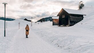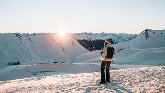 Unsere Wahl fällt auf den beliebten Panorama-Genussweg. Panorama & Genuss – das klingt doch wie für uns gemacht. Los geht’s an der BERGSTATION der Möseralmbahn. Von dort verläuft der Winterwanderweg auf aussichtsreichen 1.800 Metern Seehöhe ungefähr fünf Kilometer lang bis zur MITTELSTATION der Komperdellbahn. Alternativ kann man selbstverständlich auch in die entgegengesetzte Richtung marschieren. Der Weg ist bestens beschildert und beeindruckt mit einem fantastischen Panorama.