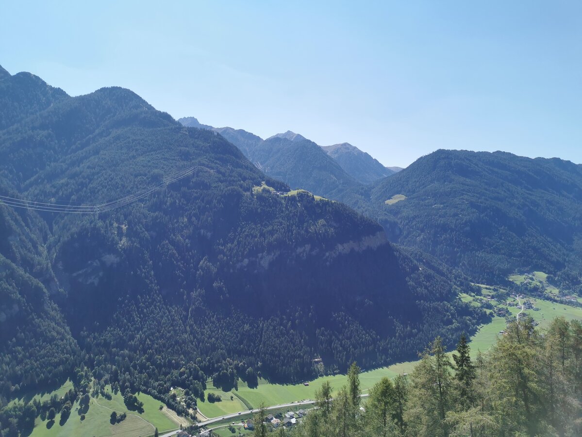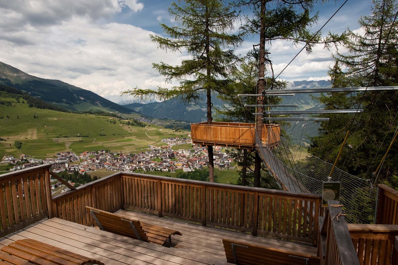 Die Aussichtsplattform "Adlerhorst" ist zwischen Bäumen gebaut und über eine schwindelerregende Hängebrücke erreichbar. Wer sich über die Holzbrücke wagt, wird mit einem beeindruckenden Fernblick belohnt. Hier können du und deine Liebsten das Dorf Serfaus aus der Vogelperspektive erkunden und bestaunen. Zudem genießt ihr einen Weitblick über die gesamte Umgebung bis zu den Ötztaler Alpen. Vor der eigentlichen Plattform laden Holzbänke auf einer Plattform zum Rasten und Verweilen ein. Einfach herrlich! Und speziell für Naturliebhaber wie mich und meine Begleiter ein echter Augenschmaus! Hier packen wir unsere mitgebrachte Jause aus und lassen uns das frische Brot, den Almkäse und das sprudelnde Wasser schmecken. Gut gestärkt geht es wieder weiter auf unserer Tour.