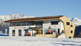 2015 wurde in Bertas Kinderland sogar eine eigene KINDERVILLA gebaut. Ich gebe zu: Ein bisschen NEIDISCH bin ich auf die Skizwerge von heute schon. Dieses dreistöckige Haus hätte mir bestimmt auch gefallen. Bertas Kindervilla setzt dem ganzen Konzept der Skischule Fiss-Ladis nochmal eine sehr große SAHNHAUBE auf. Häubchen ist da definitiv untertrieben. Die Villa ist nämlich äußerst LUXURIÖS und verbindet spielerisch Elemente eines Kindergartens mit einem Skikurs. So geht Kinderanimation heute. Ich schnalle meine Skier neben Bertas Outdoor-Bühne ab und trete neugierig in Bertas Reich ein.