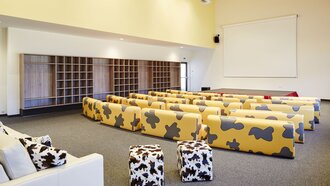 Im Kinderhaus entdecke ich sogleich einen bunten BERTA-SHOP, einen riesigen ANIMATIONSRAUM mit Kuhflecken-Muster, kindgerechte Toiletten, ein eigenes KINDERSKIDEPOT im Keller und sogar eine eigene Elternterrasse. Unter den vielen Räumlichkeiten finde ich zudem den sogenannten SCHNEEABENTEUERRAUM. Dieser ist speziell für Kinder von drei bis vier Jahren eingerichtet. Auch die jüngsten Gäste sind somit perfekt betreut. Die Villa spielt alle Stücke: Auch Schulungs- und Seminarräume finden Platz in der Villa. „Wir haben uns bemüht, ein COOLES KINDERHAUS zu schaffen“, sagt Eva.