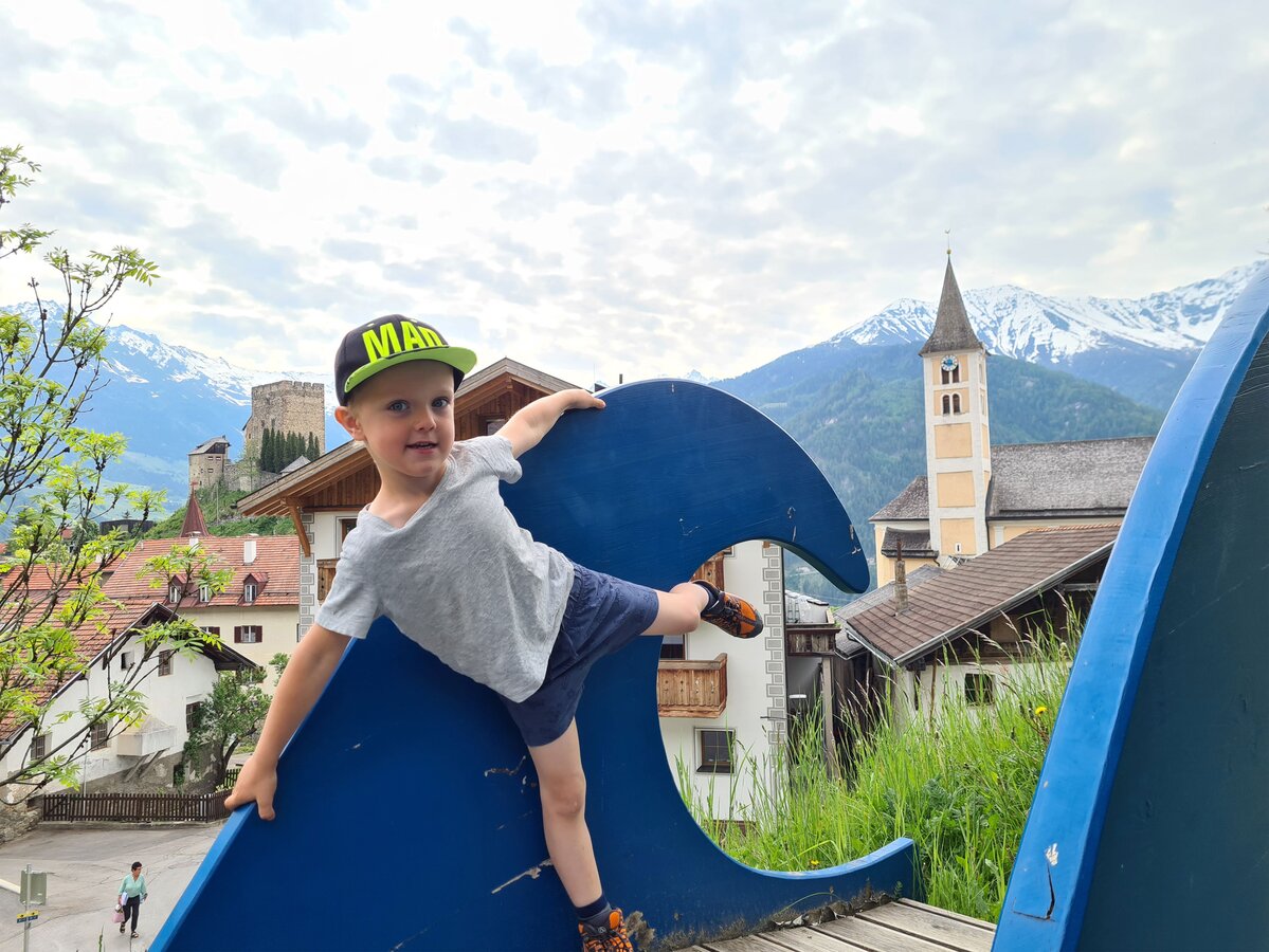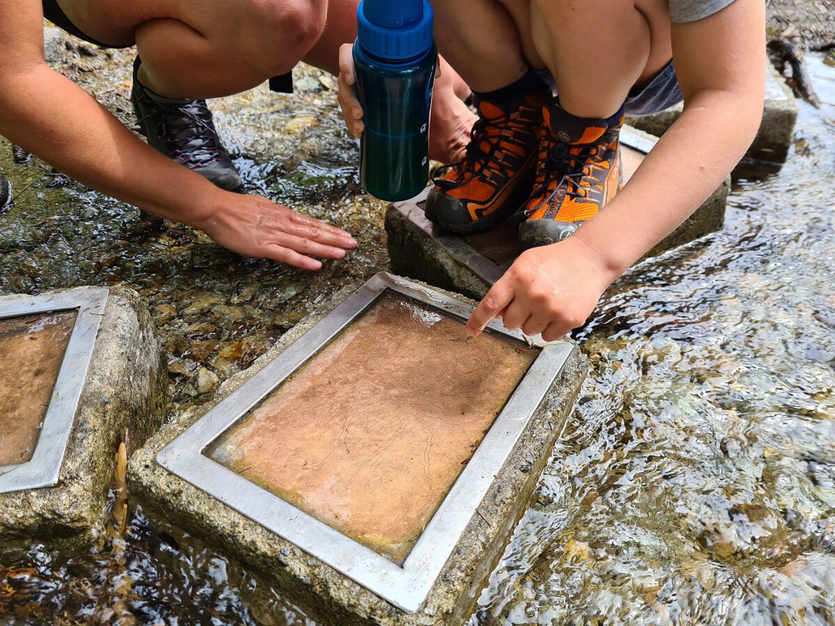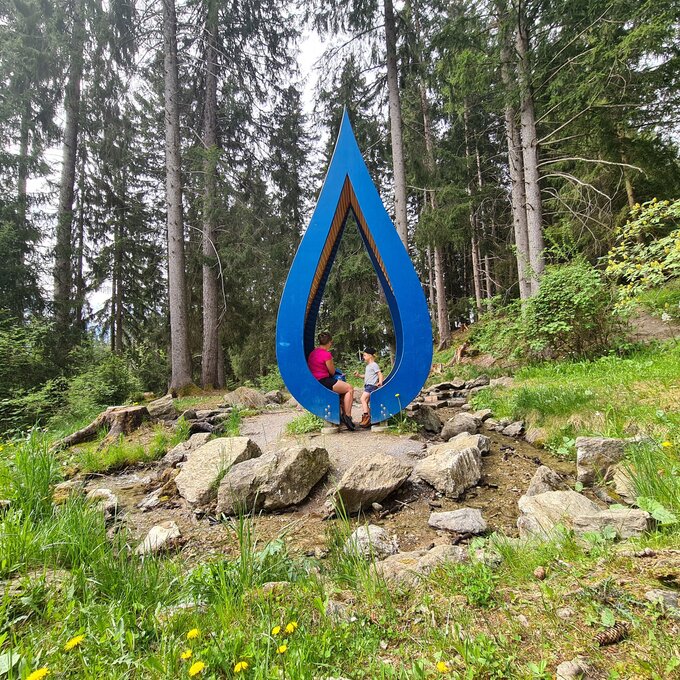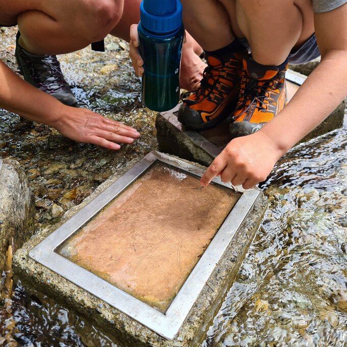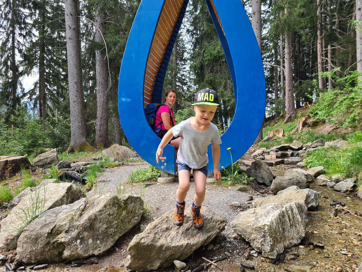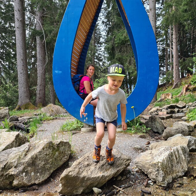 Oben angekommen, fällt der Blick auf eine beeindruckende Bank, die die Form eines riesigen Wassertropfens hat und scheinbar über dem fließenden Bach schwebt. Während die Erwachsenen eine wohlverdiente Pause einlegen können, haben die Kinder die Möglichkeit, fröhlich im klaren Bach zu plantschen. Wenn man gut hinsieht, bergen so manche Kieselsteine und Felsbrocken im Bachbett versteinerte Überreste vergangener Lebewesen. Mit aufmerksamen Augen können die Kinder voller Neugier nach diesen Schätzen suchen und aufregende Entdeckungen machen.