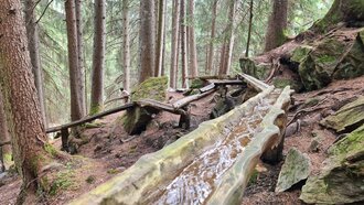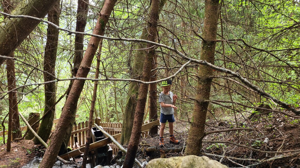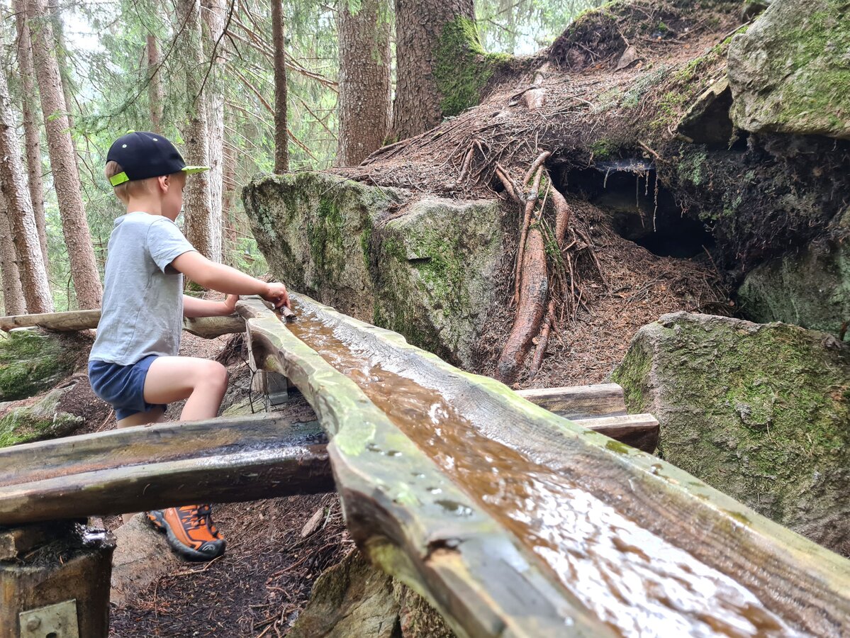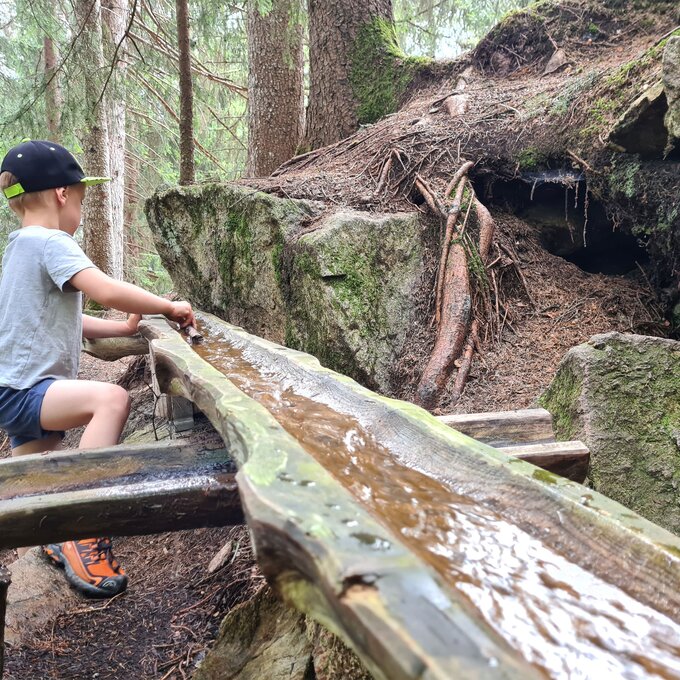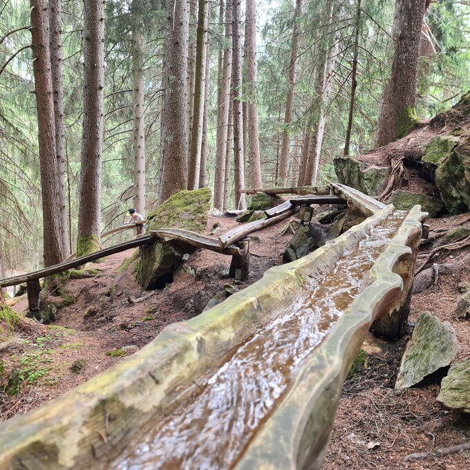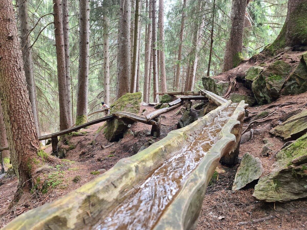 Eine aufregende Wasserstraße aus hohlen Baumstämmen erstreckt sich durch die wunderschöne Natur. Das Wasser fließt darüber wie in einem Labyrinth. Dieses faszinierende Schauspiel begeistert nicht nur Kinder sondern auch Erwachsene und hinterlässt einen Eindruck des Staunens und der Bewunderung. Hier können sich die Kleinen ein wenig austoben. Sie können ihre Hände in das klare Wasser tauchen, kleine Boote schwimmen lassen oder versuchen, die Strömung zu beeinflussen.