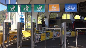 Der Einstieg in die Gondel ist stressfrei. An den Gondelbahnen, die Bikes transportieren können (alle Sommerbahnen außer Möseralmbahn), gibt es separate Bike-Eingänge. Das jeweilige Ticket einfach an den Sensor halten und rechts das Bike durchschieben. Ein Kinderspiel!