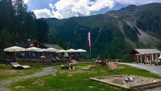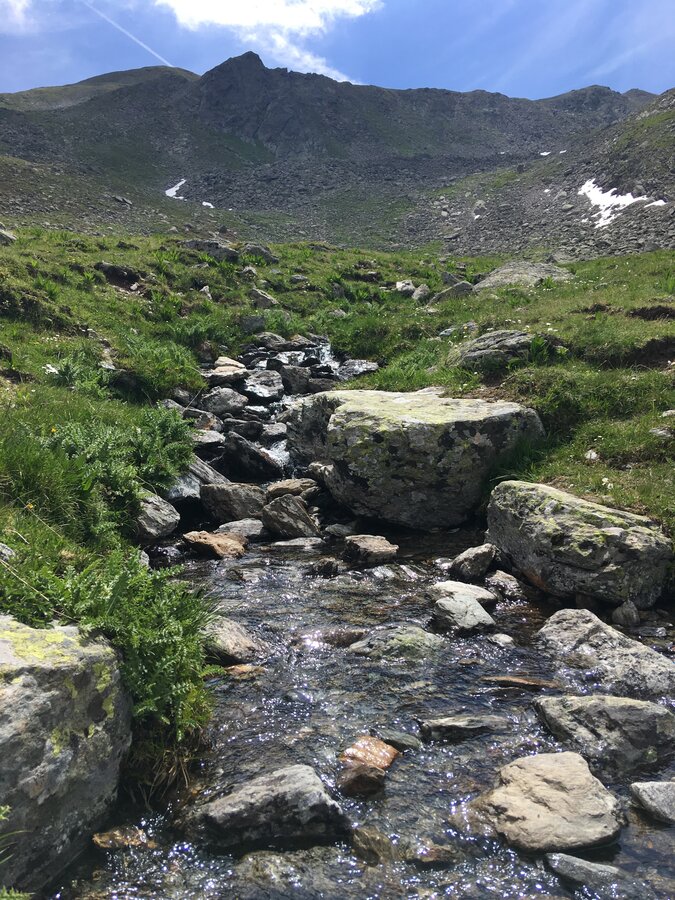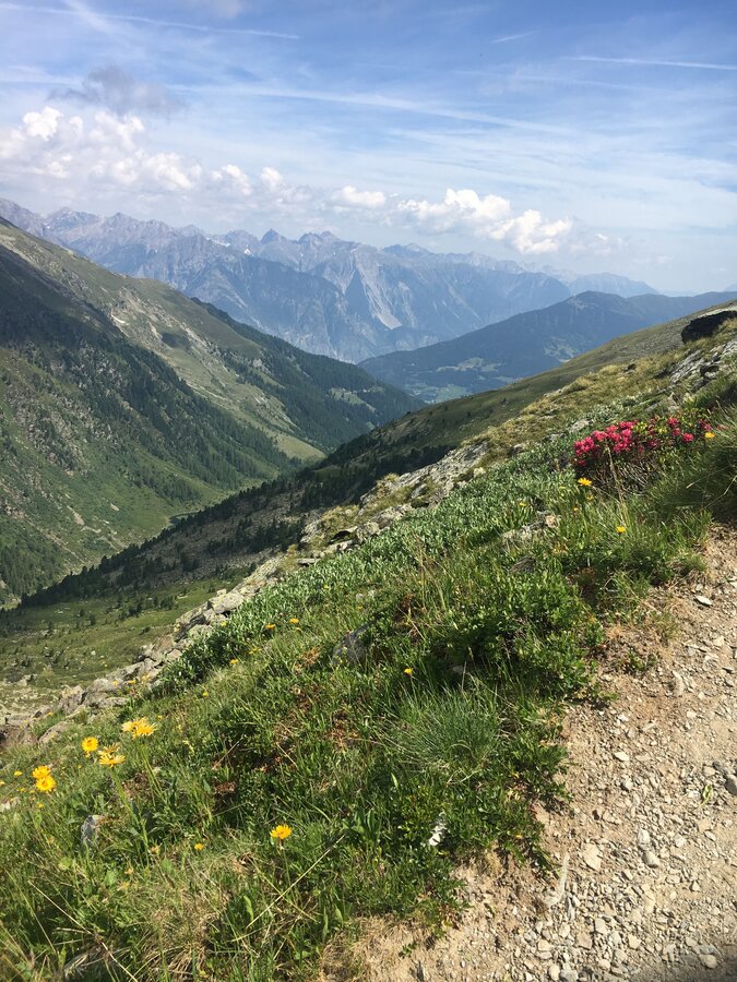 Der Ausblick, der sich uns dabei bot, war wirklich traumhaft schön. Idyllisch führte der Weg durch das saftige Grün der Bergwiesen, vorbei an zahlreichen blühenden Almrosen und anderen schönen Blumen. Da der Weg hauptsächlich neben dem Urgbach verlief, begleitete das sanfte Plätschern unsere Schritte. Aufgrund der sommerlichen Temperaturen, war das kühle Nass eine willkommene Abkühlung für uns. Nachdem rund eine weitere Stunden Wanderzeit verging, gelangten wir zum Eingang des Tales, wo der Urgbach in einen kleinen See mündet. Der Platz neben diesem Natursee, mit Blick auf das Seitental, lädt definitiv zum Verweilen ein. Da uns jedoch noch einiges bevorstand, gönnten wir uns lediglich eine kurze Verschnaufpause.