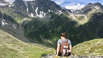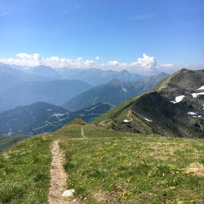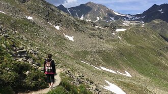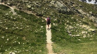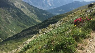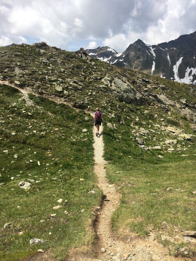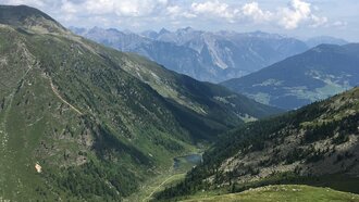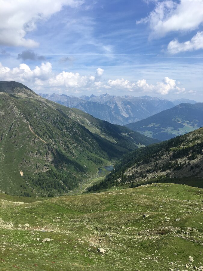 Oben am Zwölferkopf angekommen, gingen wir entlang des Grates in Richtung Oberer Sattelkopf/Vorderer Brunnenkopf. Kurz vor dem Oberen Sattelkopf folgten wir dem Spinnseensteig, um ins malerische Urgtal zu gelangen. Ein schmaler, aber dennoch gut ausgebauter Pfad, führte uns von dort schon bald in kargeres, steinigeres Gelände. Gutes Schuhwerk ist auf jeden Fall notwendig! Unterwegs begegneten uns kaum andere Wanderer und diese Ruhe machte die Wanderung für uns zu einem echten Erlebnis. Nach ungefähr 1,5 Stunden Wanderzeit erreichten wir eine Anhöhe, von der aus wir einen ersten Blick auf das Urgtal erhaschten.