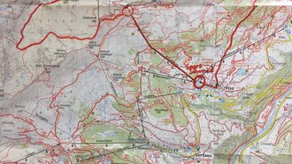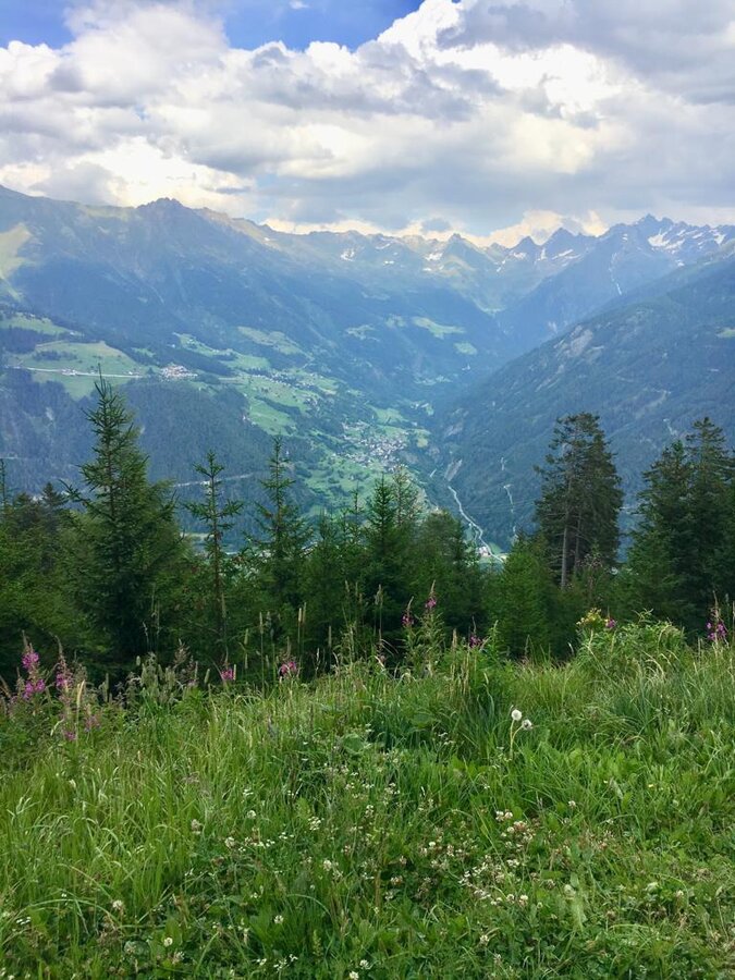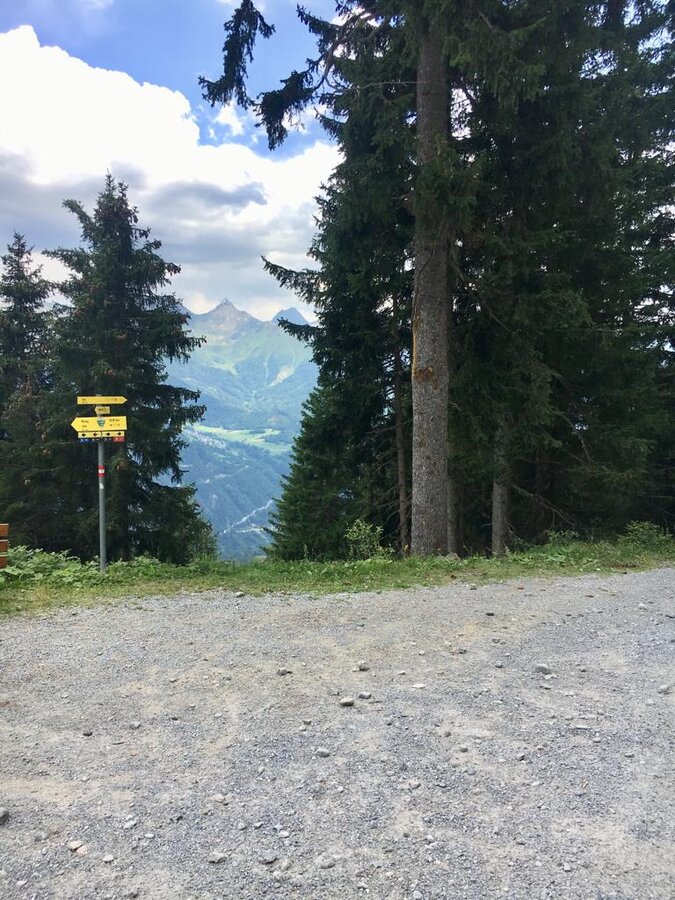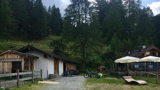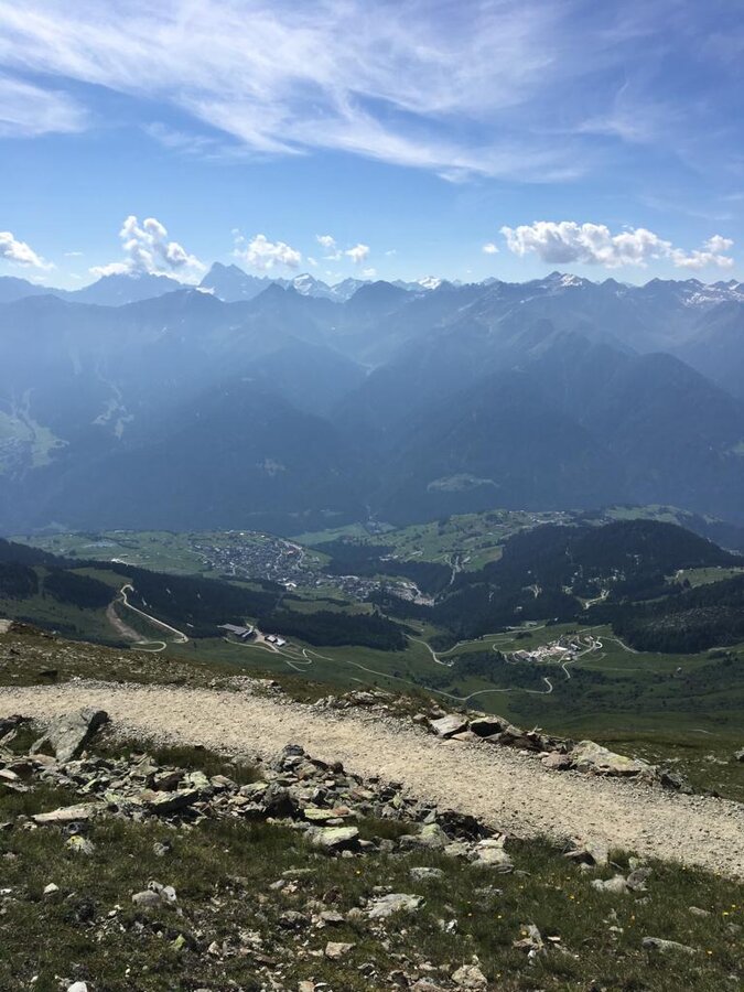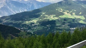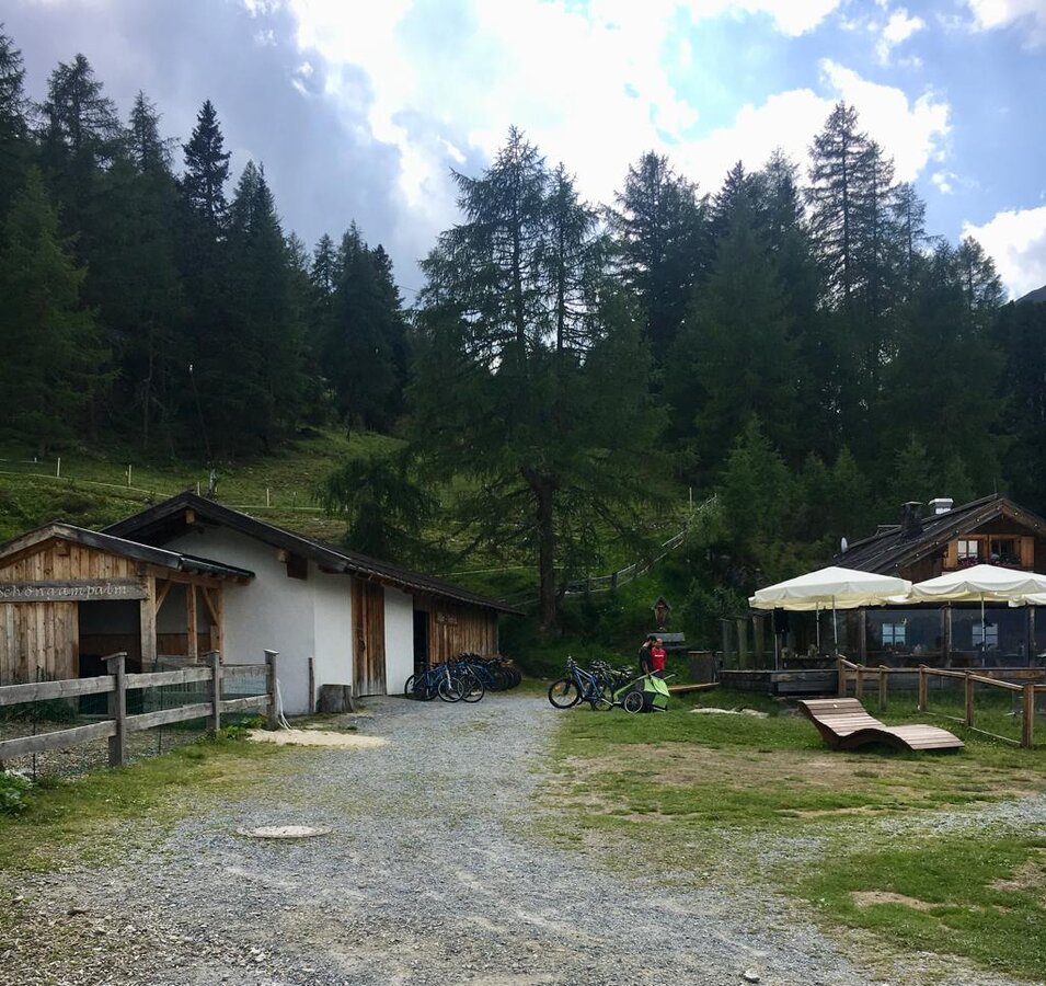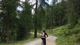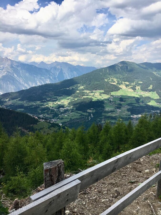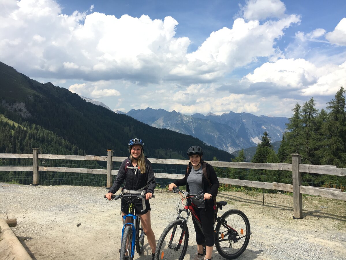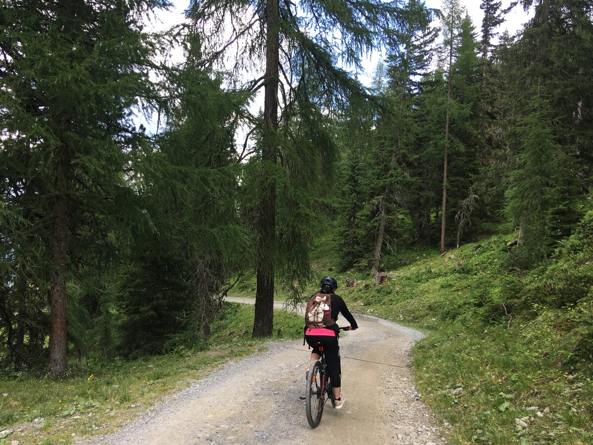 Gestärkt machten wir uns anschließend auf zum Bikeverleih, welcher sich direkt neben der Alm befindet. Die freundlichen Mitarbeiter Daniel und Matti statteten uns mit modernen und bestens gewarteten Mountainbikes aus und passten diese fachkundig an unsere Körpergröße an. Und sogleich schwangen wir uns auf unsere Bikes und radelten motiviert und voller Vorfreude los in Richtung Fiss. Zunächst folgten wir dem Schotterweg in Richtung Talstation der Almbahn. Ein breiter Forstweg führte uns anschließend durch sanfte Wälder. Ab diesem Zeitpunkt konnten wir das Rad größtenteils laufen lassen und mussten nur wenige Male in die Pedale treten. Wir ließen uns den Fahrtwind um die Nase wehen und hatten sichtlich Spaß am Radvergnügen.