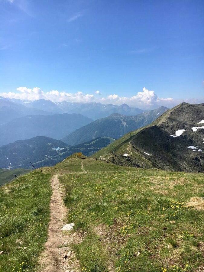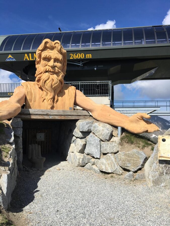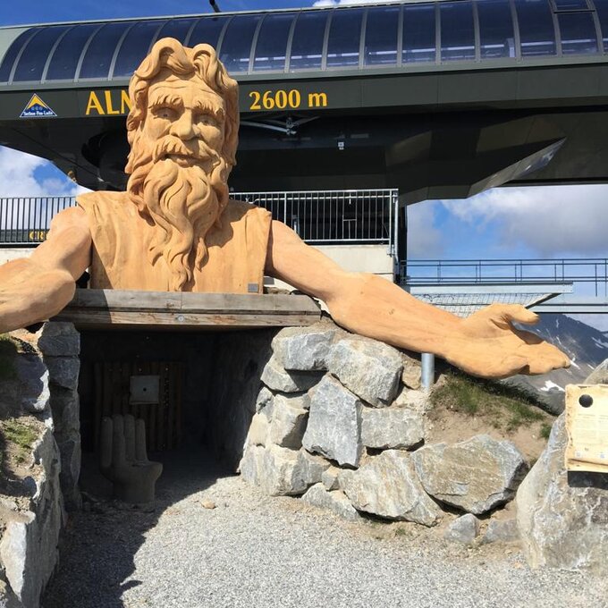 Zeitig in der Früh ging es für uns mit der Schönjochbahn bei traumhaftem Wetter hinauf aufs Fisser Joch. Dort erwartete uns bereits eine atemberaubende Aussicht auf die umliegende Bergwelt. Nachdem wir diesen besonderen Moment mit einem Foto festgehalten hatten, machten wir uns auf den Weg. Zunächst führte uns der neu angelegte „Goldene-Mann-Weg“ hinauf zur Aussichtsplattform Z1. Entlang des Themenweges gilt es, zahlreiche Rätsel rund um die Sage des Goldenen Mannes zu lösen, der dort einst, gemeinsam mit fiesen Gnomen, hauste. Nach etwa einer Stunde Gehzeit, wurden wir zum Abschluss noch vom Goldenen Mann persönlich empfangen.