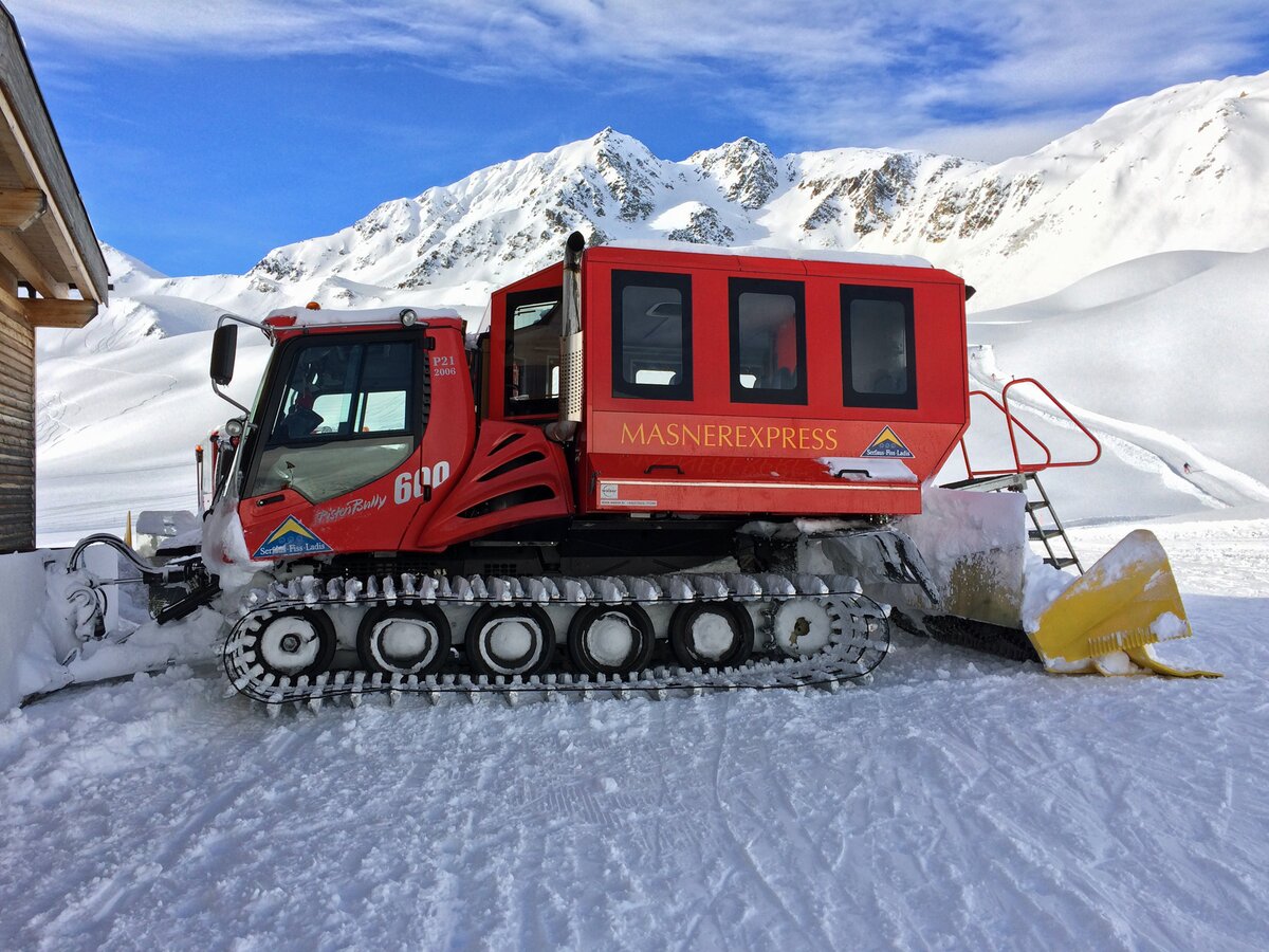Schon der Anblick allein machte ordentlich Eindruck. Die neun Tonnen schwere umgebaute Präpariermaschine bewegte sich kraftvoll und doch virtuos über die Schneehänge zum Treffpunkt auf 2.351 m.
