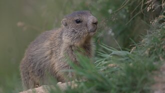 Das Alpen-Murmeltier gehört zur Unterfamilie der Erdhörnchen. Ihr Lebensraum ist oberhalb der Waldgrenze auf Alpinen Rasenflächen und es ist bei uns noch sehr häufig anzutreffen.