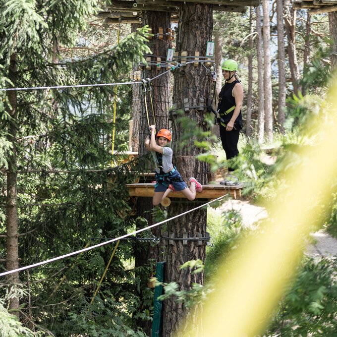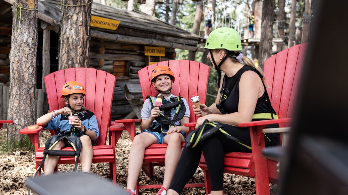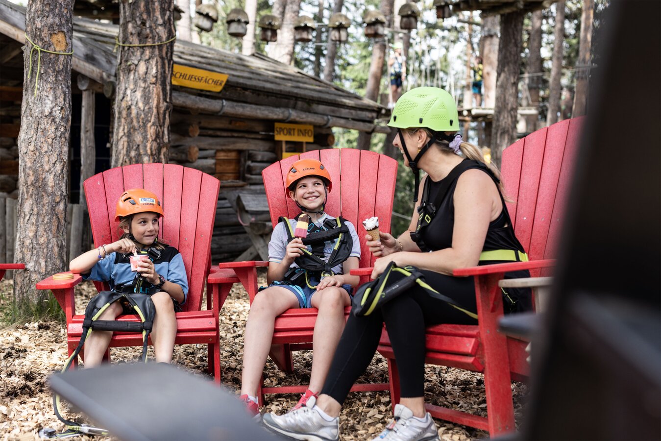Wir starten mit einem blauen Parcours. Wie auf den Skipisten gibt es auch im X-Trees Waldseilpark Farben, die den Schwierigkeitsgrad der Übungen anzeigen: Die blauen Parcours sind die Einsteigerstrecken. Sie sind maximal acht Meter hoch und dürfen auch von Kindern ab einer Körpergröße von 1,10 Metern alleine absolviert werden. Die drei roten Parcours sind schon schwieriger: Beim Parcours „Masnerflug“ wartet etwa eine 90 Meter lange Seilrutsche. Für die roten Strecken müssen Kinder mindestens 1,30 Meter groß sein, unter 14 Jahren braucht es eine erwachsene Begleitperson. Die schwarzen Parcours „Furgler“ und „Pezid“ sind für ganz besonders mutige und geübte X-Trees-Kraxler. Die Übungen finden hier in bis zu 14,5 Metern Höhe statt. Kinder müssen für die schwarzen Parcours mindesten 1,50 Metern groß sein und bis zu einem Alter von 14 Jahren von einem Erwachsenen begleitet werden – Chiara und Finn sind noch nicht groß genug, ich atme erleichtert auf.