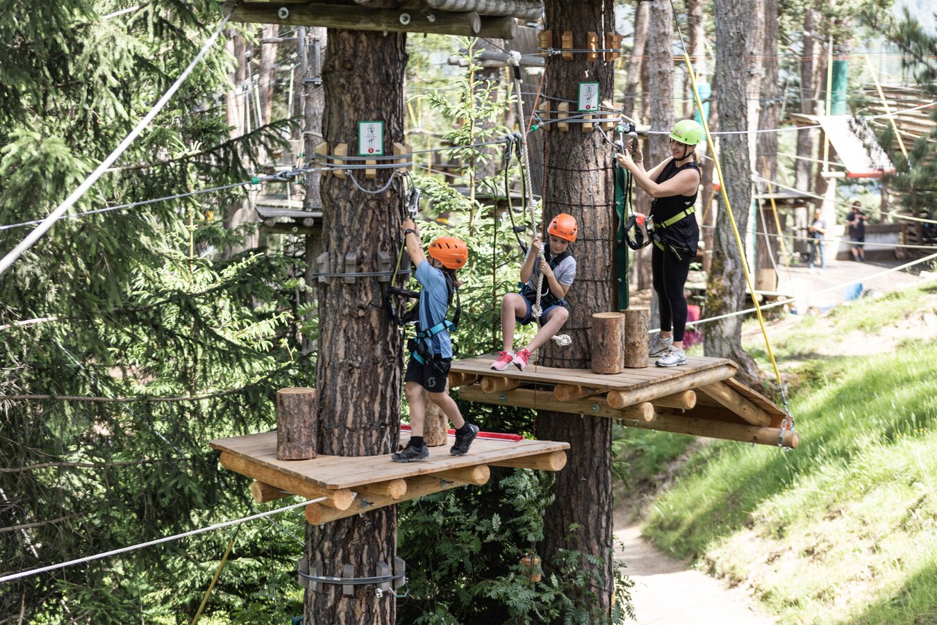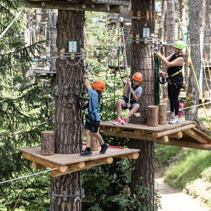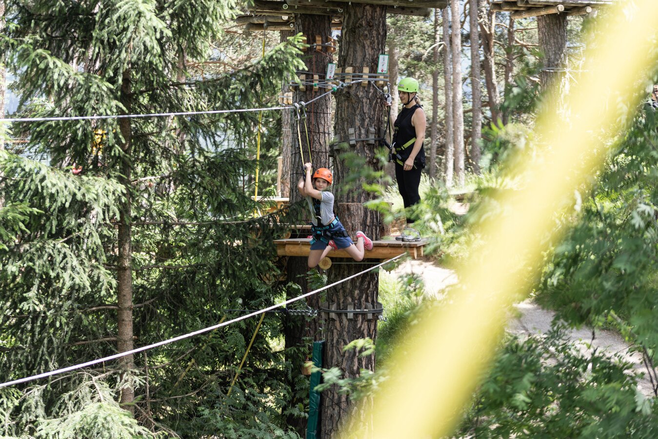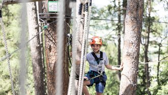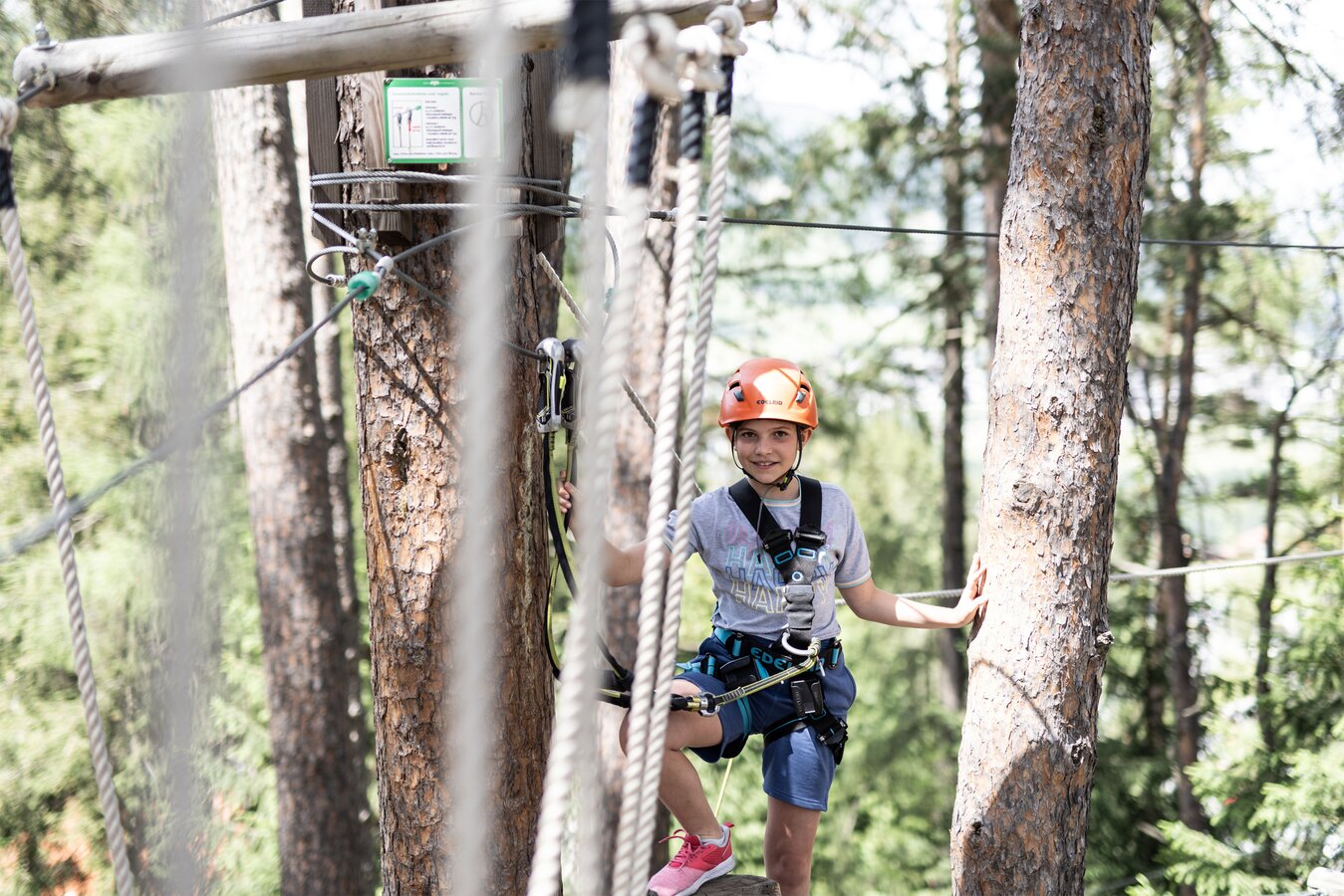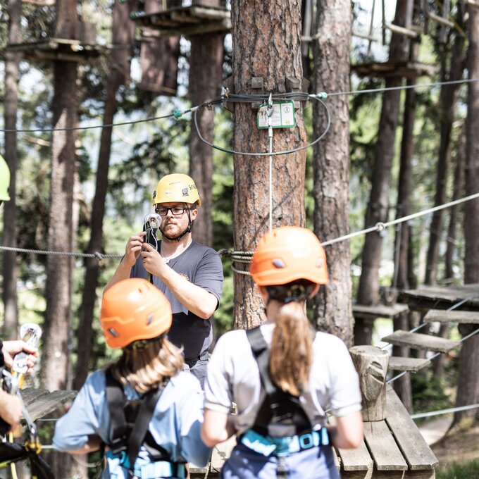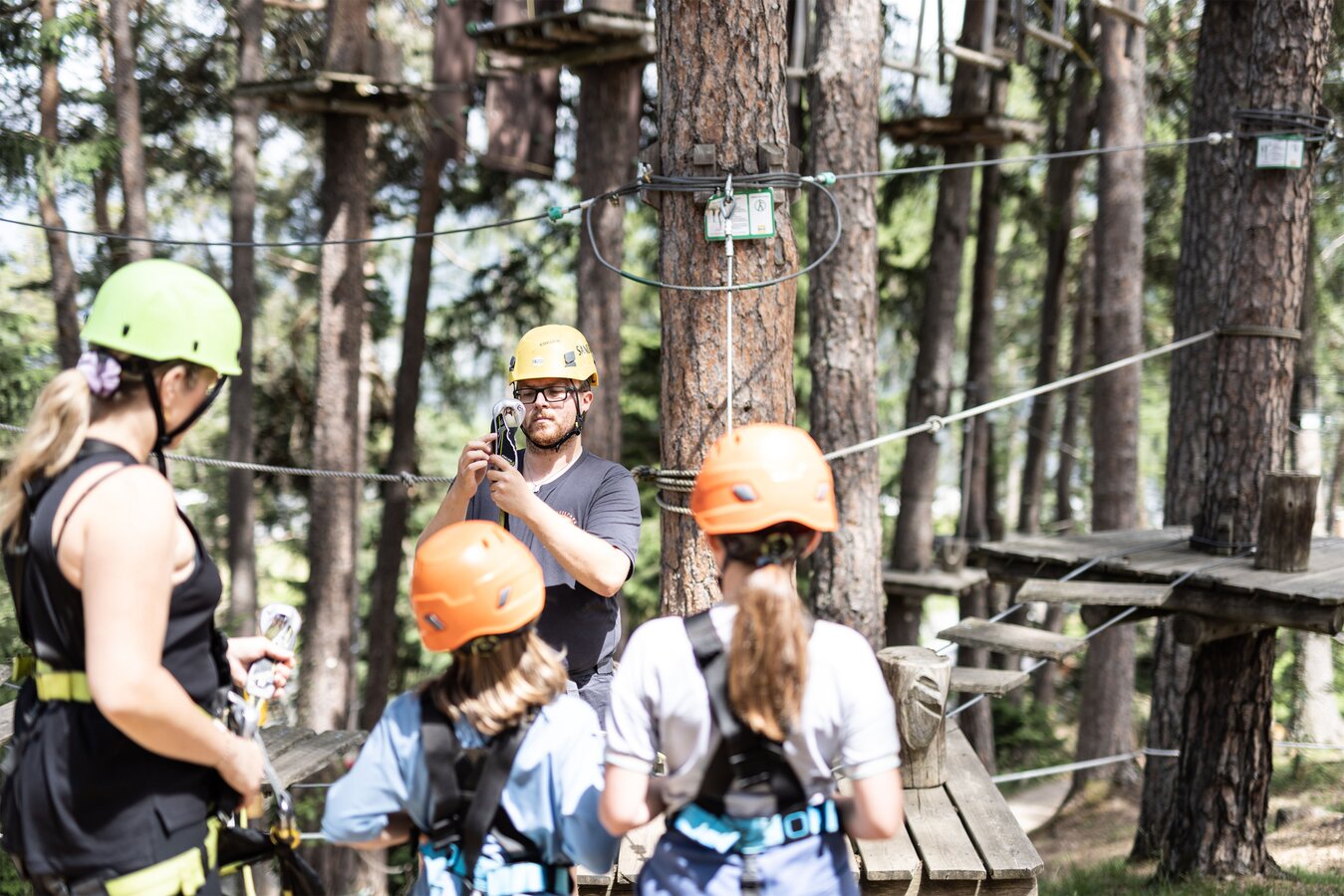 Welchen Trick hat Sandro, wenn man mit Höhenangst kämpft? „Nicht nach unten schauen.“ Sehr witzig. Er zeigt auf einen der roten Parcours, bei dem man sich auf freischwebenden Kletterwänden von einer auf die andere Seite hangeln muss: „Bei diesem Parcours geht der erste Blick nach vorne, aber der zweite Richtung Boden. Davon darf man sich nicht den Mut nehmen lassen: Am besten sucht man sich ein Ziel am Ende des Parcours – wie einen Baumstamm und fokussiert darauf.“ Was noch wichtig ist: Sich Zeit nehmen, immer wieder stehenbleiben und tief durchatmen.