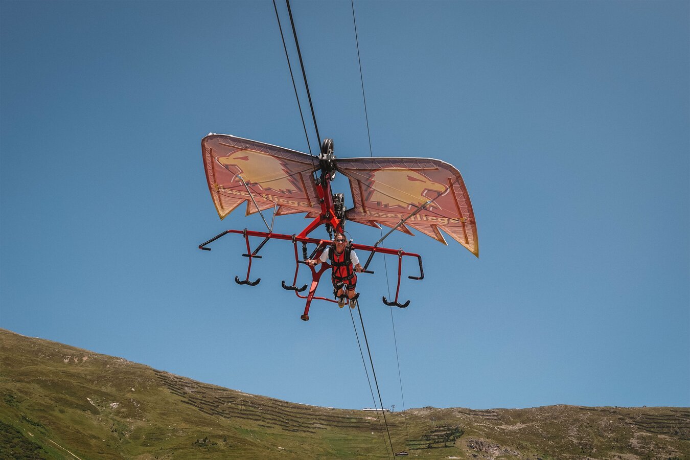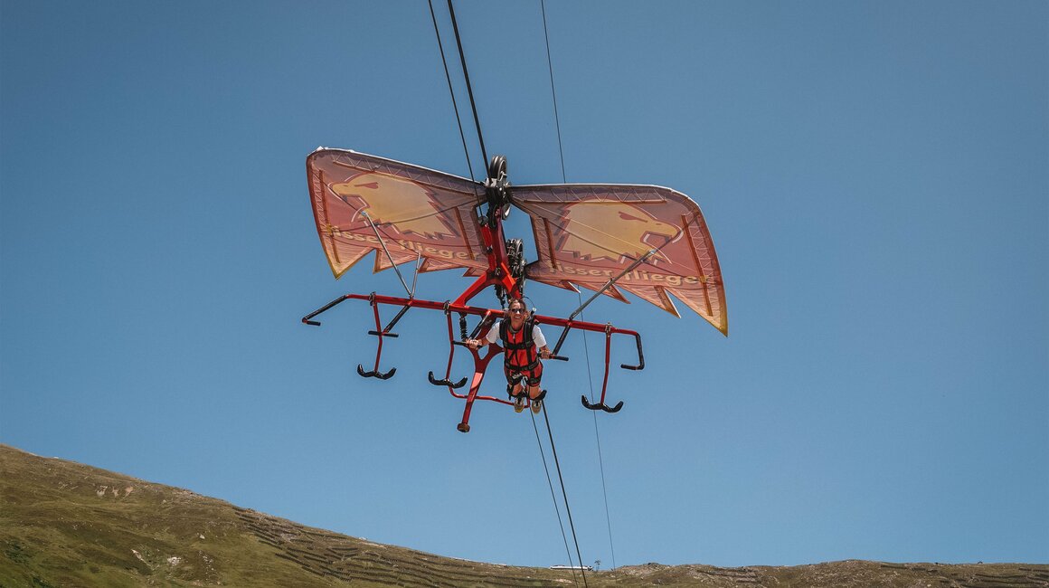 Zu den absoluten Highlights zählt der Fisser Flieger, ein Fluggerät, das vier Personen gleichzeitig in Bauchlage durch die Lüfte sausen lässt. Mit bis zu 80 Stundenkilometern „fliegst“ du über Almwiesen hinweg und fühlst dich schwerelos. Gleich daneben sorgt die Skyswing für Gänsehautmomente: Je nach Mut kannst du dich mit sanftem Schwung oder im freien Fall mit Überschlag durch die Luft katapultieren lassen.