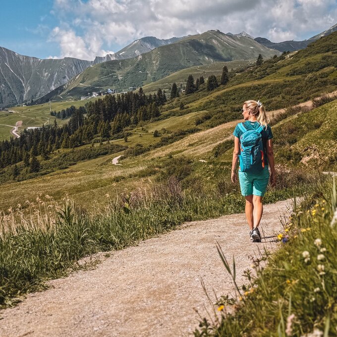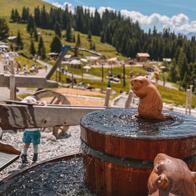 Gleich neben dem Sommer-Funpark Fiss startet der Panorama-Genussweg. Auf der Route durch blühende Almwiesen und schattige Wälder bietet er immer wieder atemberaubende Ausblicke auf das umliegende Bergpanorama. Die Strecke verläuft flach, bis auf einen kurzen Anstieg zum Komperdell. Hier erwartet dich das Murmliwasser, ein fantasievoll gestalteter Erlebnispark am Bach, in dem Kinder nach Herzenslust plantschen, spielen und die Natur entdecken können. Mit Wasserrädern, Flößen, Hängebrücken und dem Murmli-Höhlenlabyrinth ist Spaß für die ganze Familie garantiert.