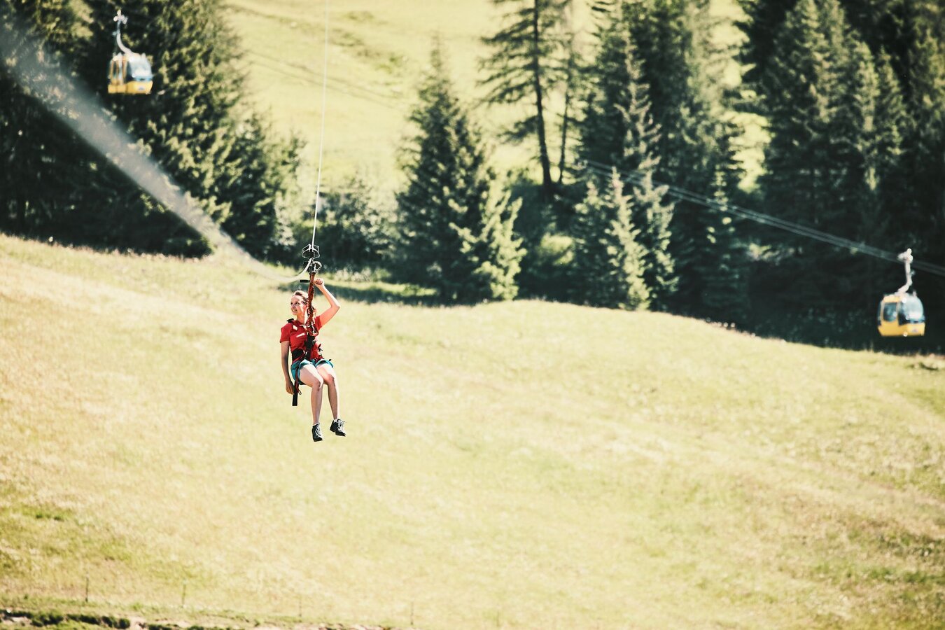 "Safety first" heißt es natürlich auch hier. Mir wird alles in Ruhe erklärt und ich werde ordnungsgemäß mit einer Pilotenweste bestückt. Die Gaudi verläuft über vier Flugstrecken, insgesamt rausche ich über eine Strecke von 2.000 m talwärts. Da sollte dann also genug Zeit bleiben, den Ausblick und den Flug zu genießen, oder? Nun geht’s rauf auf die Waage. Die Rolle wird nämlich je nach Körpergewicht ausgewählt. Falsch machen kann man beim Sausen nichts – gebremst wird nämlich automatisch. Auch die Guides auf den vier Plattformen sorgen auf der kompletten Strecke für optimale Sicherheit.