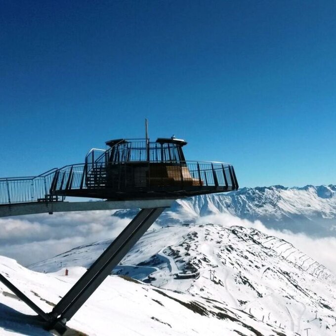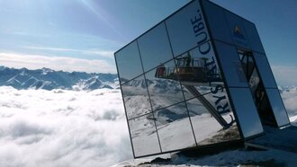 Der Crystal Cube ist ein verspiegelter Glaswürfel, der schräg am Berg klebt und neben der Aussichtsplatform Z1 in Fiss auf 2.600 Metern liegt.