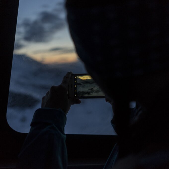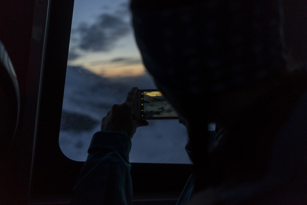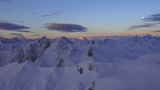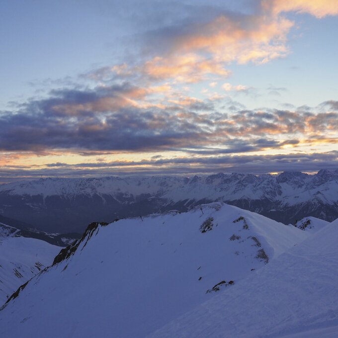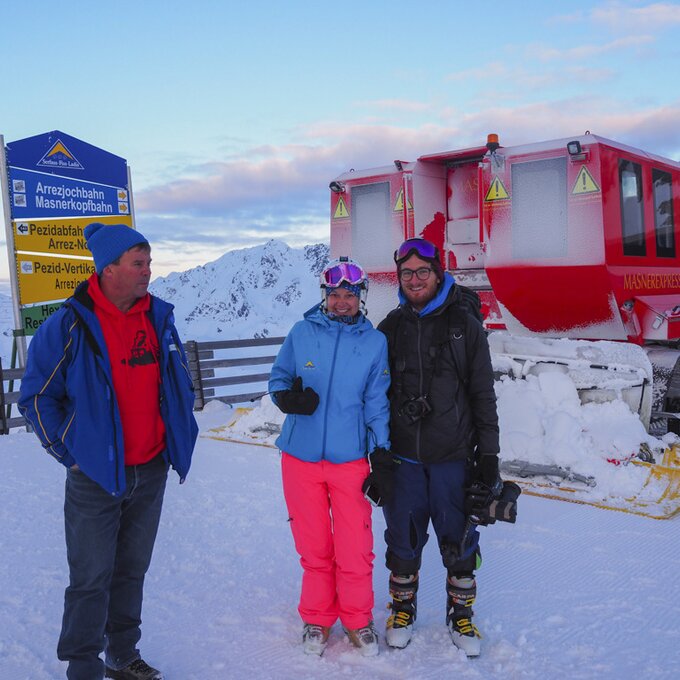 An der Talstation der Komperdellbahn in Serfaus warten an diesem Dienstagmorgen noch weitere Frühaufsteher um mit dem Masner Express auf 2588 Meter gebracht zu werden. Der Masner Express ist eine Pistenraupe zum Personentransport, die groß und fast einschüchternd am Ende der Piste auf uns wartet. Maximal 17 Personen kann der Masner Express über die Pisten hoch in das Masnergebiet chauffieren. Nicht alle der Insassen haben Ski dabei, wer möchte, kann mit dem Masner Express auch wieder zurück zur Bergstation der Lazidbahn fahren und dann mit der Bahn ins Tal gondeln. Meine Ski hingegen sind auch ein Teil der Ladung. Während der Fahrt zeichnet sich ein Silberstreifen am Horizont ab, der Schnee leuchtet in einem leichten Rosé-Ton. Vor uns sehen wir nach 30 Minuten Fahrt den ersten Stop der Fahrt, das Arrezjoch, von dem aus wir die Hexenseehütte schon sehen konnten, die Endstation dieser Fahrt. Da wir aber schon März haben und die Sonne schon weit im Osten aufgeht, erwartet uns ein unglaubliches Panorama auf eben diesem Joch. Im Westen versinkt der Vollmond langsam hinter der Vesulspitze, im Osten kämpft sich die Sonne über die Bergspitzen des Kaunertals. Was für eine unglaubliche Stimmung! Dann ist es soweit: Die Sonne geht strahlend über den Bergkämmen auf. Im meinem Kopf lege ich Beethovens Sinfonie Nr. 6 auf. Tadaaaaaaa. Okay, ich gebe zu: Das Piepsen des Weckers um fünf Uhr früh hat sich ausgezahlt!