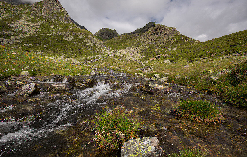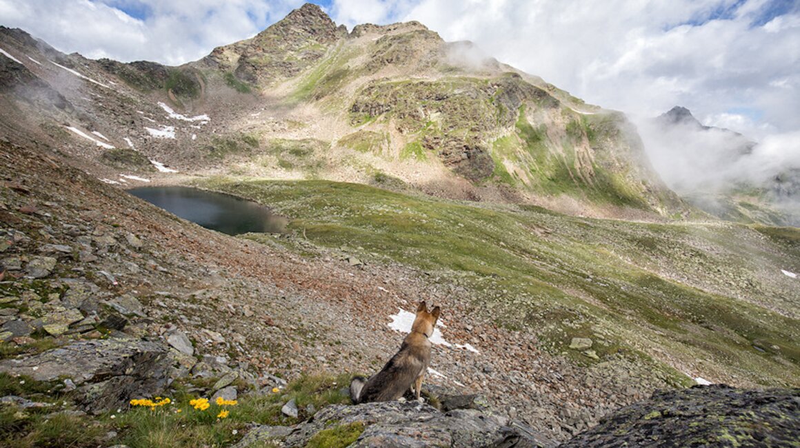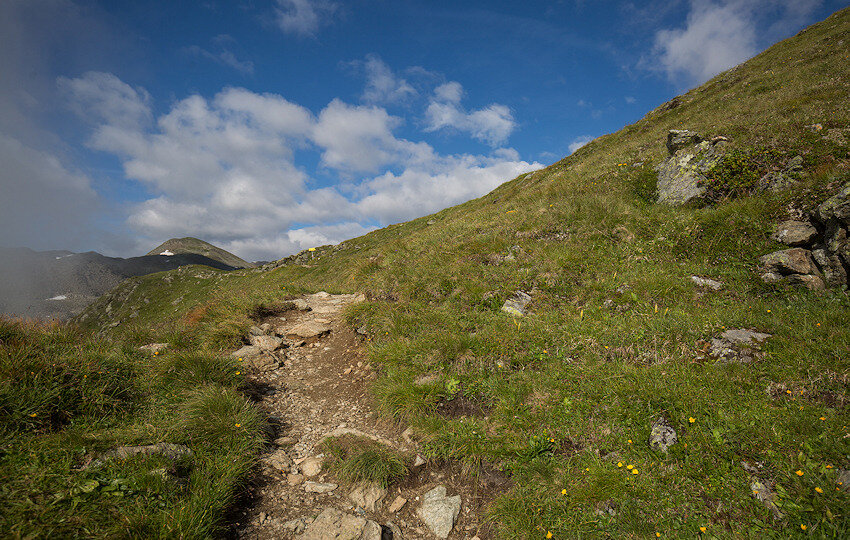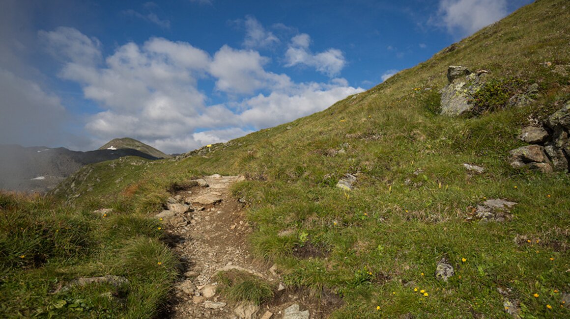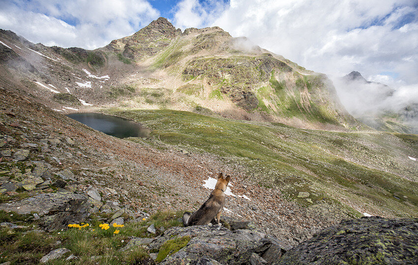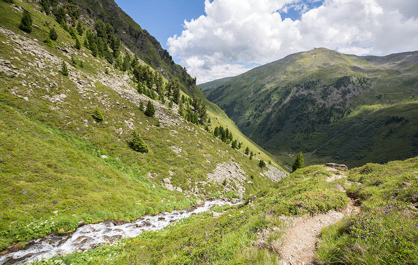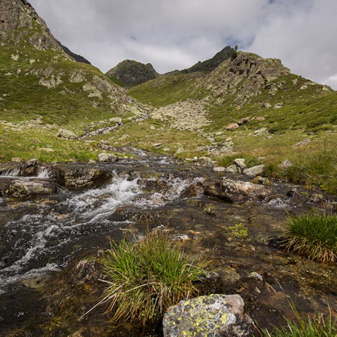 Von nun an komme ich ins schwitzen. Der Weg steigt am Bach entlang steil über einen Bergrücken an. Man ist umgeben von Felsen und Grashängen und mit dem Fernglas kann man die ein oder andere Gämse entdecken. Manchmal zieht hier auch der Adler seine Kreise, dann lassen die Murmeltiere ihre schrillen Warnpfiffe hören. Heute ist alles ruhig.
