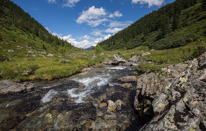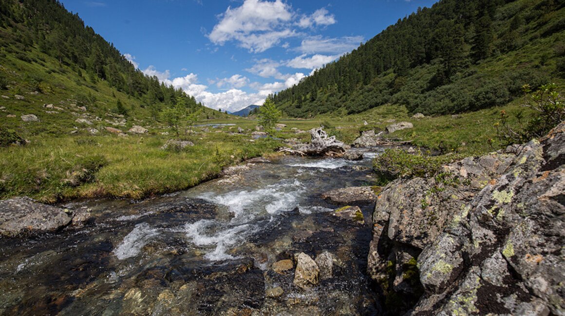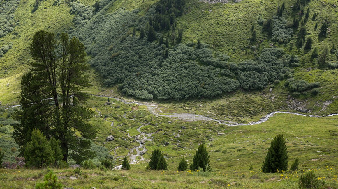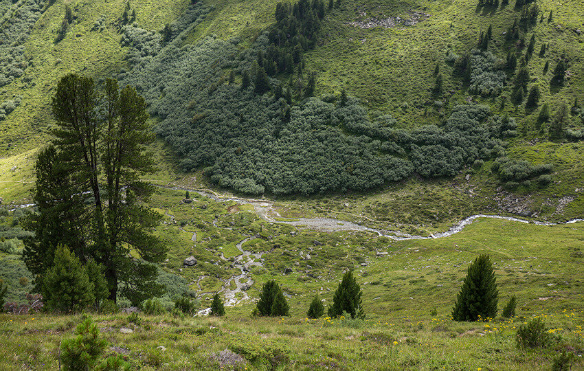 Dieser leuchtet in einem dunklen Grün und ist eingebettet in eine fantastische Bergkulisse. Hier mache ich meine Mittagspause und genieße Ruhe und Aussicht. Der folgende Abstieg ins Urgtal erfordert Trittsicherheit, da der Weg ziemlich steil nach unten führt. Im Urgtal angekommen erwartet den Wanderer die wilde Ursprünglichkeit des Urgtales. Der Wasserreichtum ist nicht zu übersehen und von allen Seiten kommt das Wasser ins Hochtal. Auffallend sind die vielen Bachmäander.