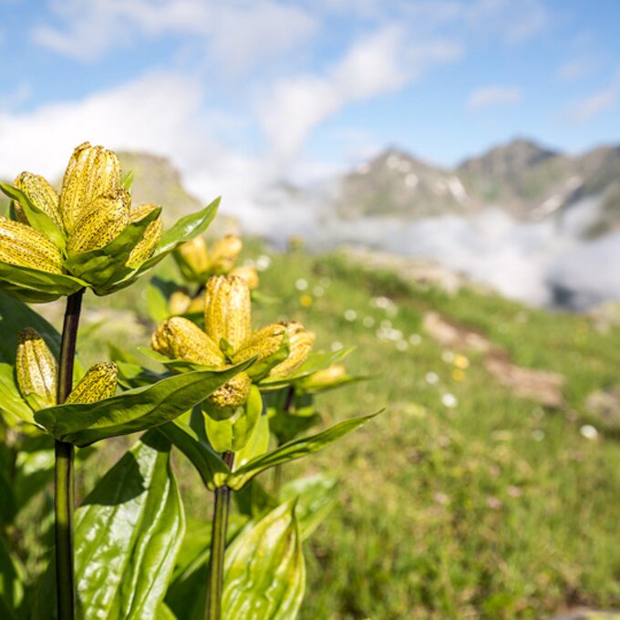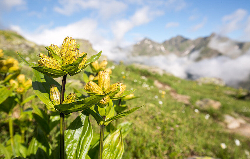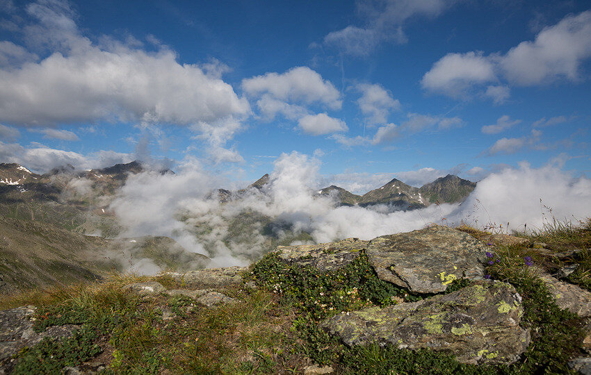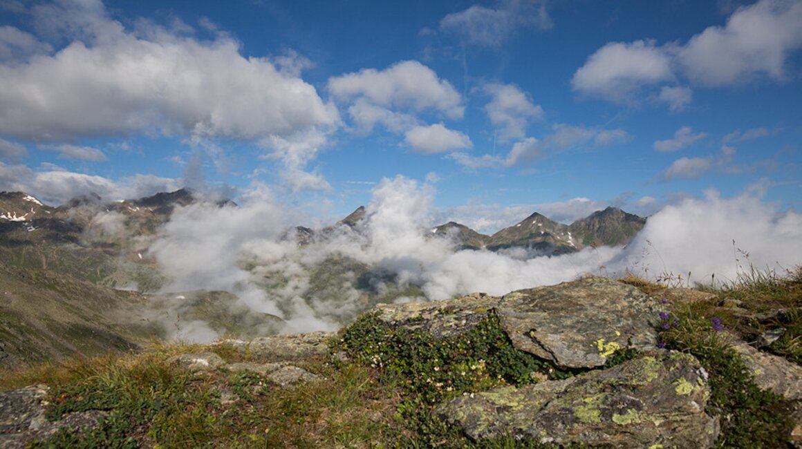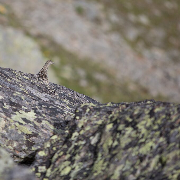 Von nun an geht’s bergab und man folgt dem Weg Nr. 16. Der Weg ist abwechslungsreich. Steinfelder, Geröll und alpine Rasenflächen wechseln sich ab. Die Vielfalt an alpiner Flora ist beeindruckend. Ich entdecke Gamswurz, gepunkteten Enzian, Arnika, verschiedene Steinbrecharten und einiges mehr. Zwischen den Steinblöcken kann man mit etwas Glück Schneehühner entdecken. Heute lässt sich sogar eines blicken.