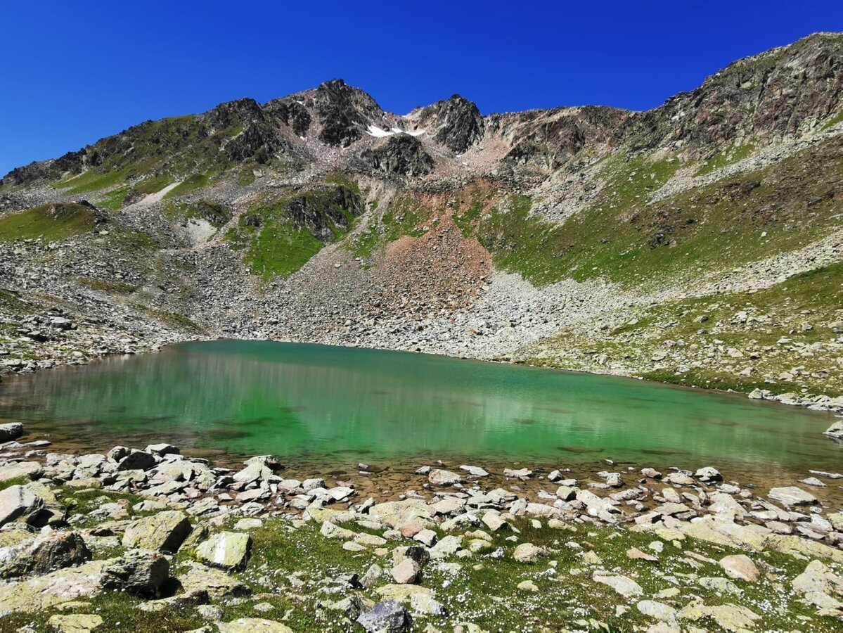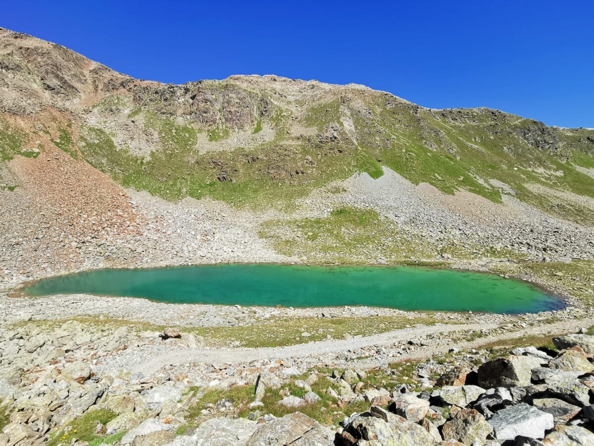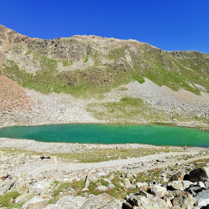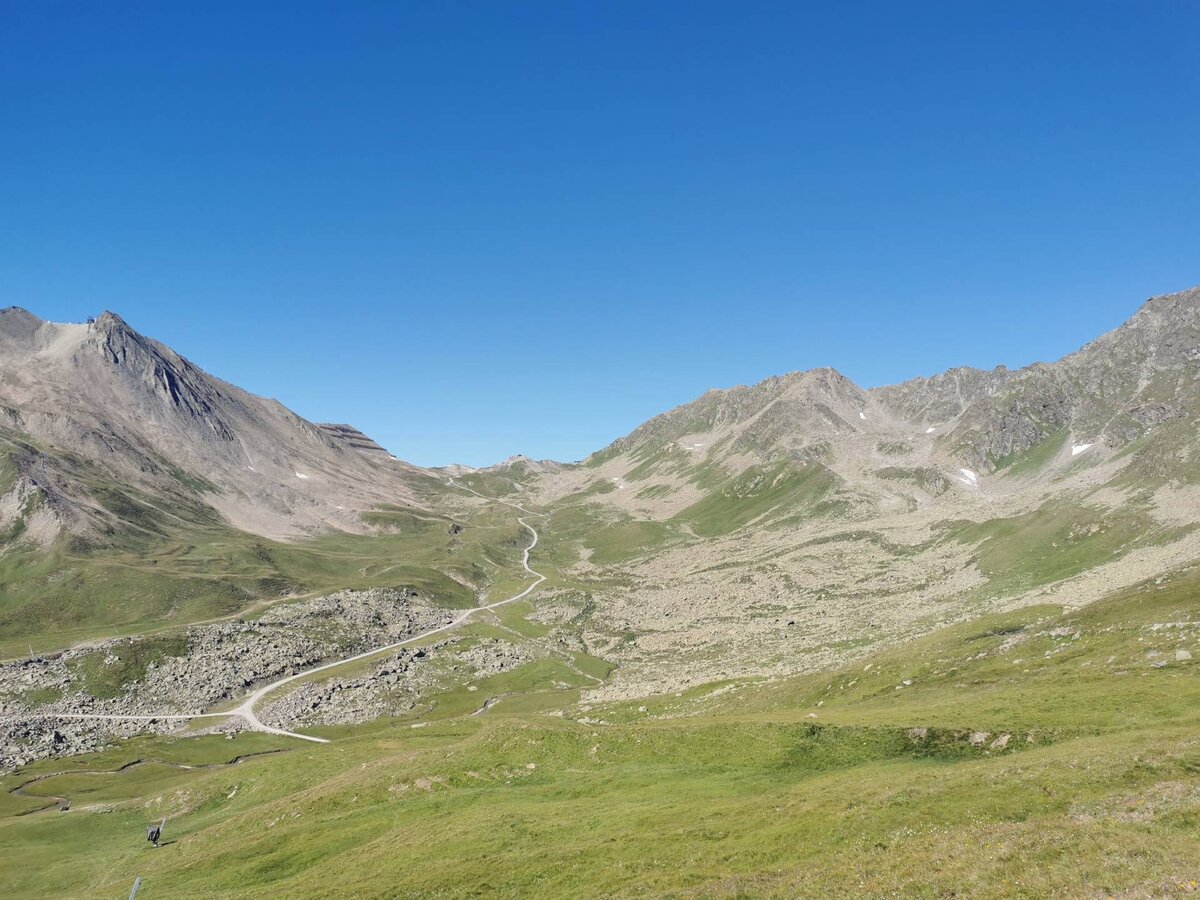 An einem heißen, nahezu wolkenlosen Augusttag, machten drei Freundinnen und ich uns auf den Weg, um auf dem Schmugglersteig vom Lazid zum Hexensee zu wandern. Mit einer der ersten Gondeln um 08.30 Uhr ging es für uns mit der Komperdellbahn hinauf auf den Lazid. Nachdem wir noch kurz innehielten, um die umliegende Bergwelt zu bestaunen, wanderten wir voller Elan und Vorfreude los. Der Einstieg des Weges ist vom Lazid aus durch Hinweisschilder gut gekennzeichnet und somit einfach zu finden. Schon bald erreichten wir die ersten Infotafeln und begaben uns während des Lesens auf eine Reise in die Vergangenheit.