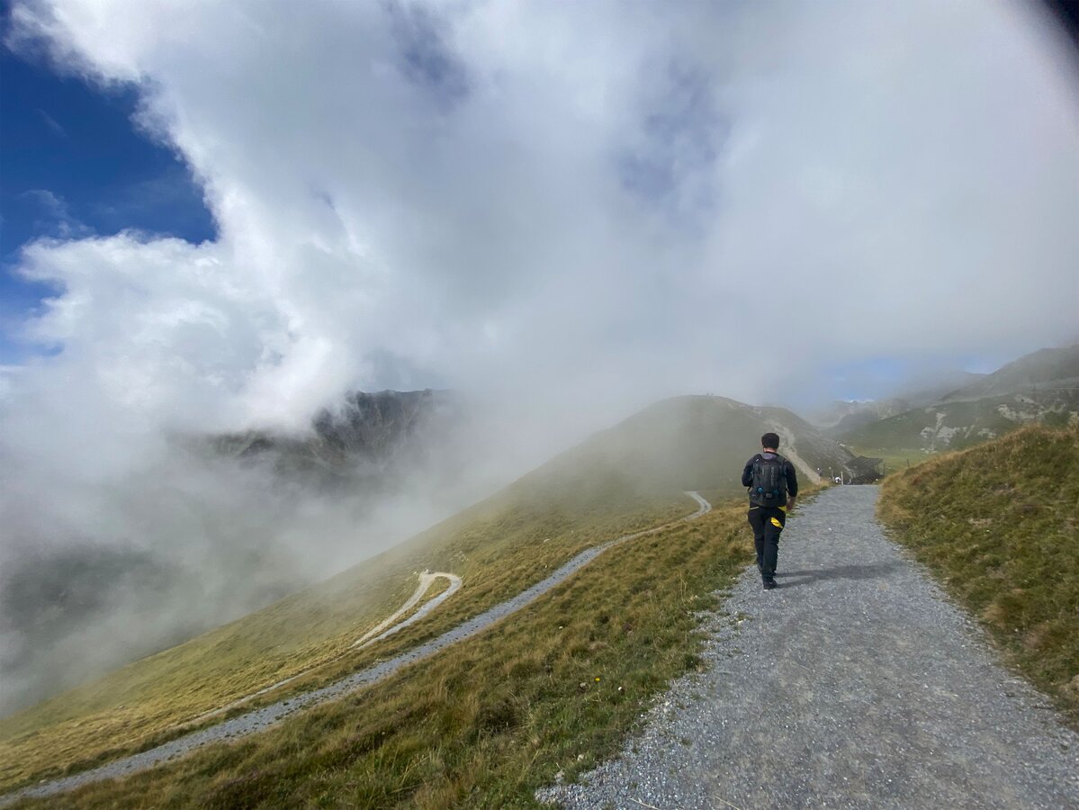 Mit dem Rücken zum See und 220 Höhenmetern vor uns, nahmen wir den letzten Abschnitt in Angriff. Kurz vor Erreichen unseres Ziels zog der Himmel sich wieder zu, und wir waren nicht mehr unter, sondern mitten im Nebel. Die Sicht auf den Weg war jedoch klar, und das ganze Erlebnis wurde erneut in eine mystische Stimmung geführt. Nach exakt 2 Stunden und 42 Minuten standen wir am Gipfelkreuz des Furgler – was für ein Moment!