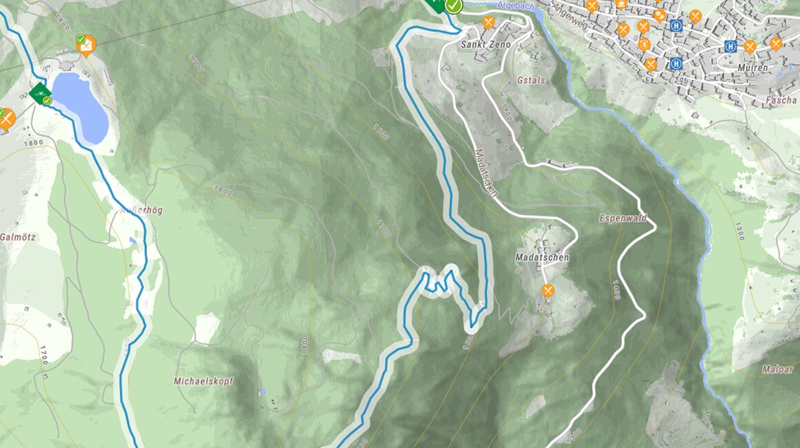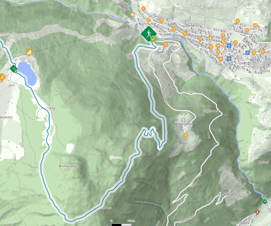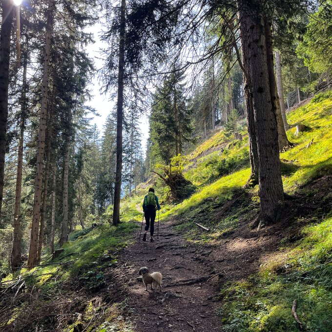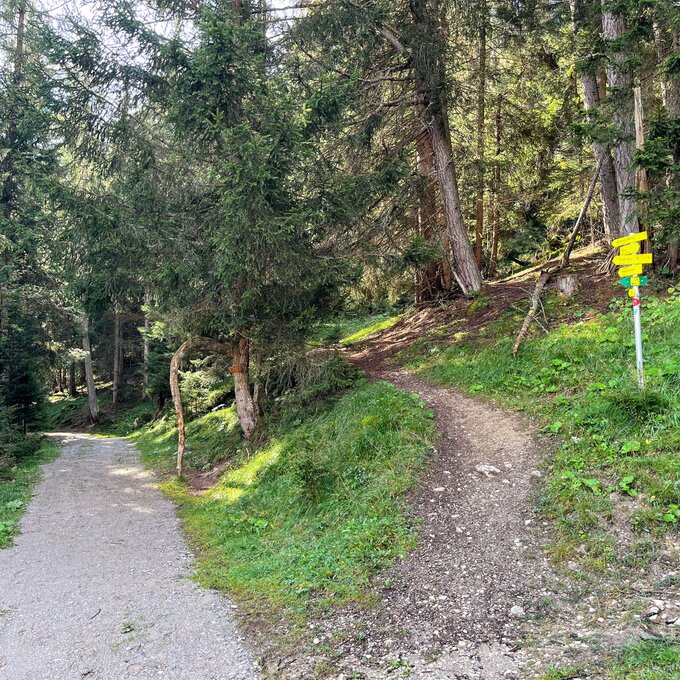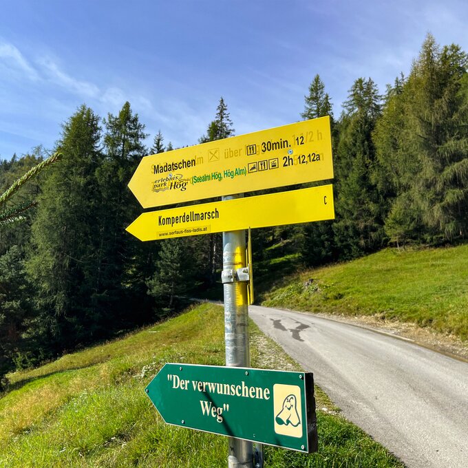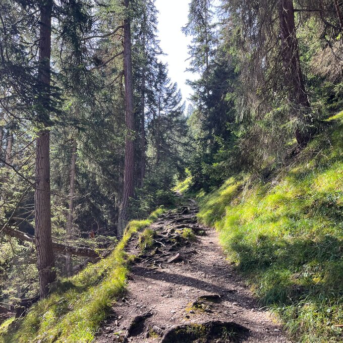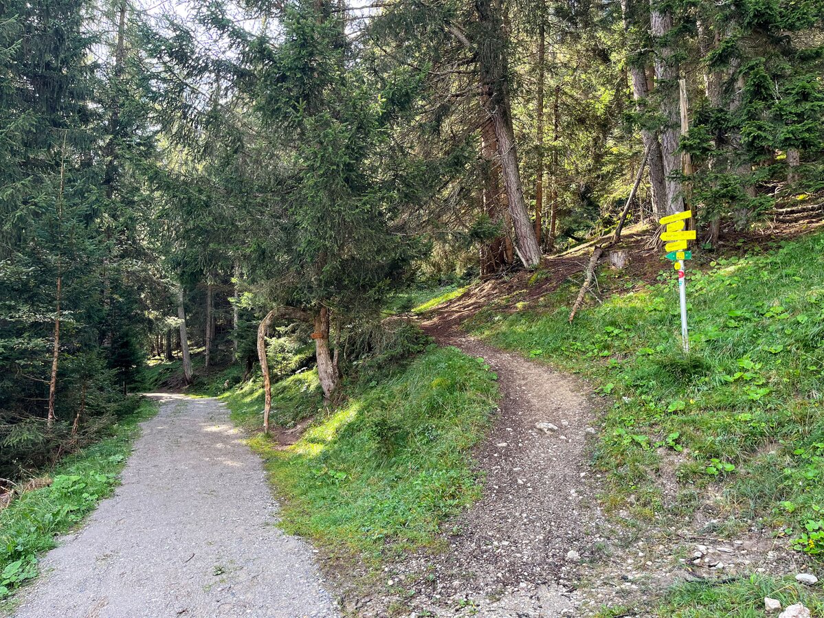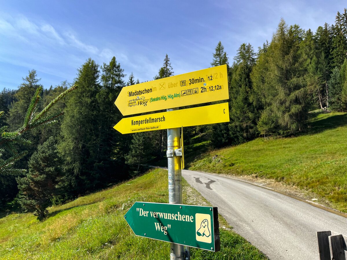 Unser Startpunkt lag am Anfang des sogenannten „verwunschenen Weges“. Wir haben dafür die St. Zeno Brücke in Serfaus überquert und sind Richtung Madatschen spaziert. An der Kreuzung zweigt der Weg steil rechts ab – ein Forstweg führt hoch bis zu einem Gatter. Ab hier beginnt das kleine Waldabenteuer.