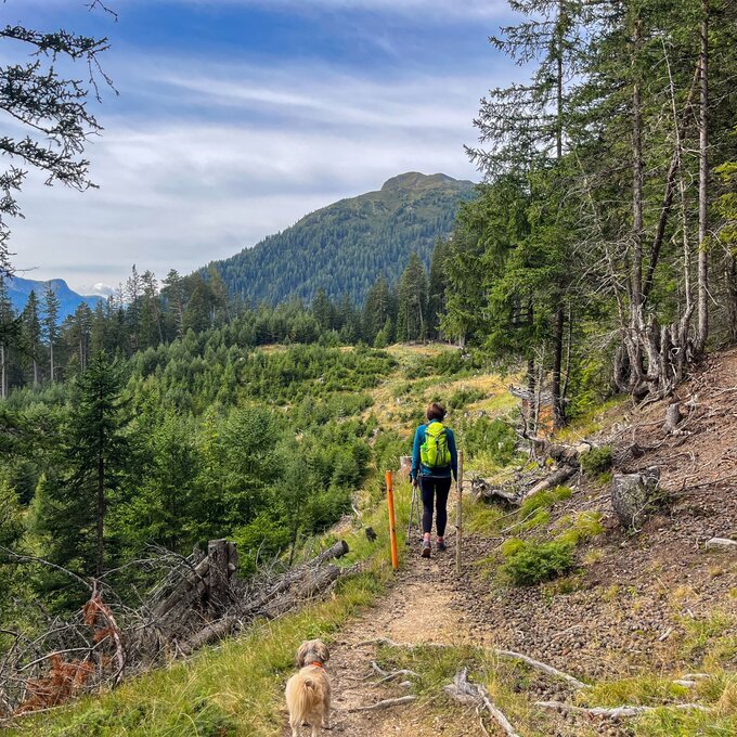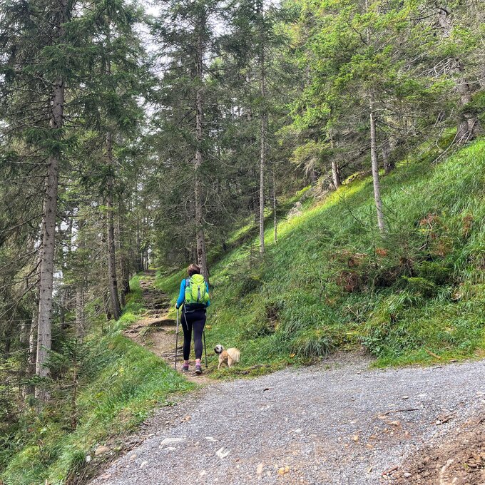 Je näher wir der Außerhög kommen, desto weiter wird der Blick, die Bäume treten langsam zurück und die Landschaft öffnet sich. Ab hier führt ein breiter Fahrweg sanft hinauf zum Högsee – unserem Ziel an diesem Tag. Der See liegt ruhig und glasklar vor uns, eingebettet in die umliegende Berglandschaft – einfach wunderschön. Wir haben uns ein stilles Plätzchen am Ufer gesucht, die Schuhe ausgezogen und die Füße im kühlen Wasser gebadet. Auch Ylvie hat sich mutig ins kühle Blau gewagt und genüsslich geplantscht.