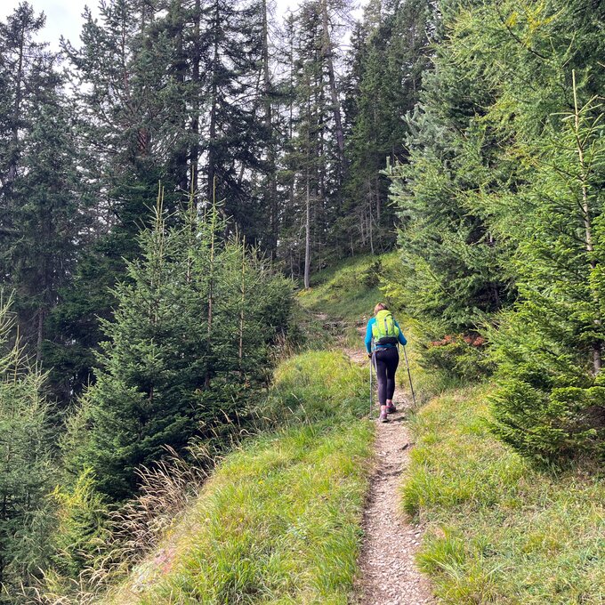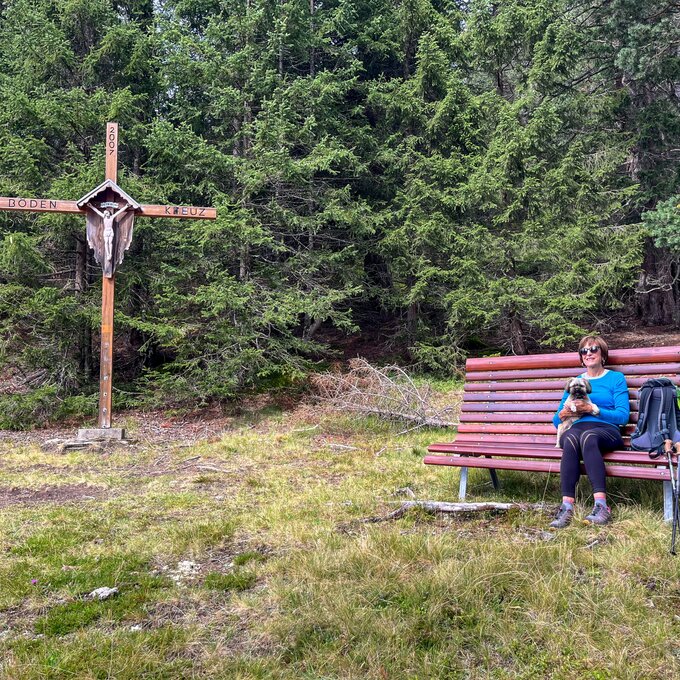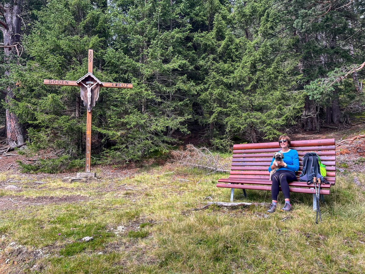 Der Weg bleibt abwechslungsreich: mal breiter, mal ganz schmal, immer begleitet von frischer Waldluft und dem Rascheln der Bäume. Nach einer Weile kamen wir wie gewohnt am Bödekreuz vorbei – ein vertrauter Ort mit Bank und Blick in die umliegene Berglandschaft, an dem wir gern kurz anhalten.