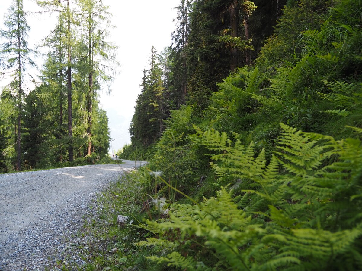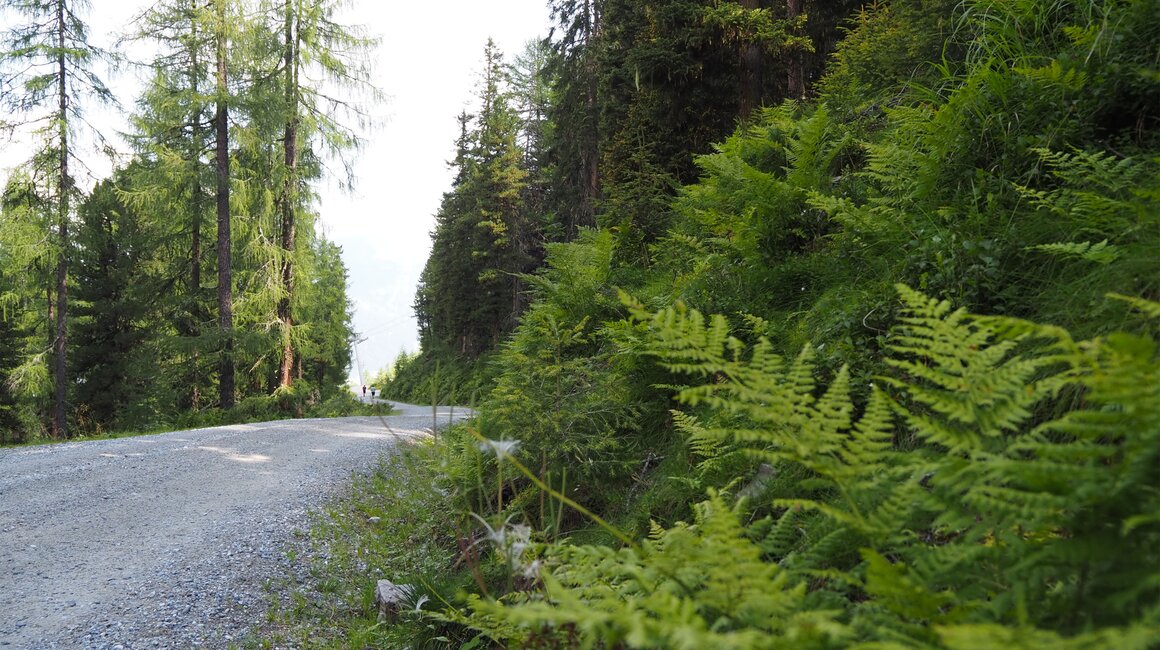 Nachdem man den Zirbenwald durchquert hat, gelangt man auf einen breiteren Forstweg, von dem aus bereits die Zirbenhütte sichtbar ist, die jedoch nur im Winter geöffnet ist. Ab diesem Punkt sind es noch etwa 40 Minuten bis zur Schöngampalm. Der Weg führt rechts unterhalb der Zirbenhütte vorbei, wo man auch einigen Kühen begegnen kann. Je näher man der Schöngampalm kommt, desto mehr verändern sich die Wälder und Wiesen. Bald betritt man einen üppigen, grünen Wald aus Farnen, neben dem ein kleiner Bach sanft plätschert. Rechts des Weges verläuft der Zirbentrail, der längste Trail in SFL, auf dem Downhiller auf 9,1 km eine Menge Spaß und Action erleben können.