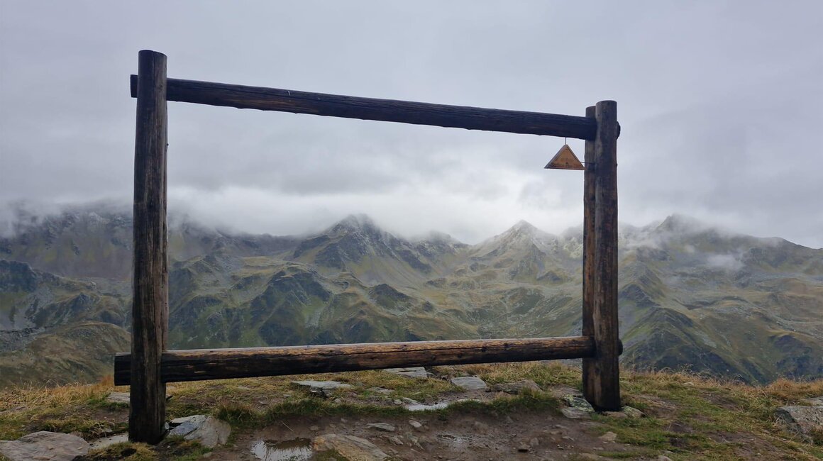 An der Bergstation der Almbahn gibt es einen Fotopoint, an dem sich ein großer Holzrahmen befindet. Dieser Rahmen bietet den perfekten Hintergrund für beeindruckende Fotos mit der Bergkulisse.