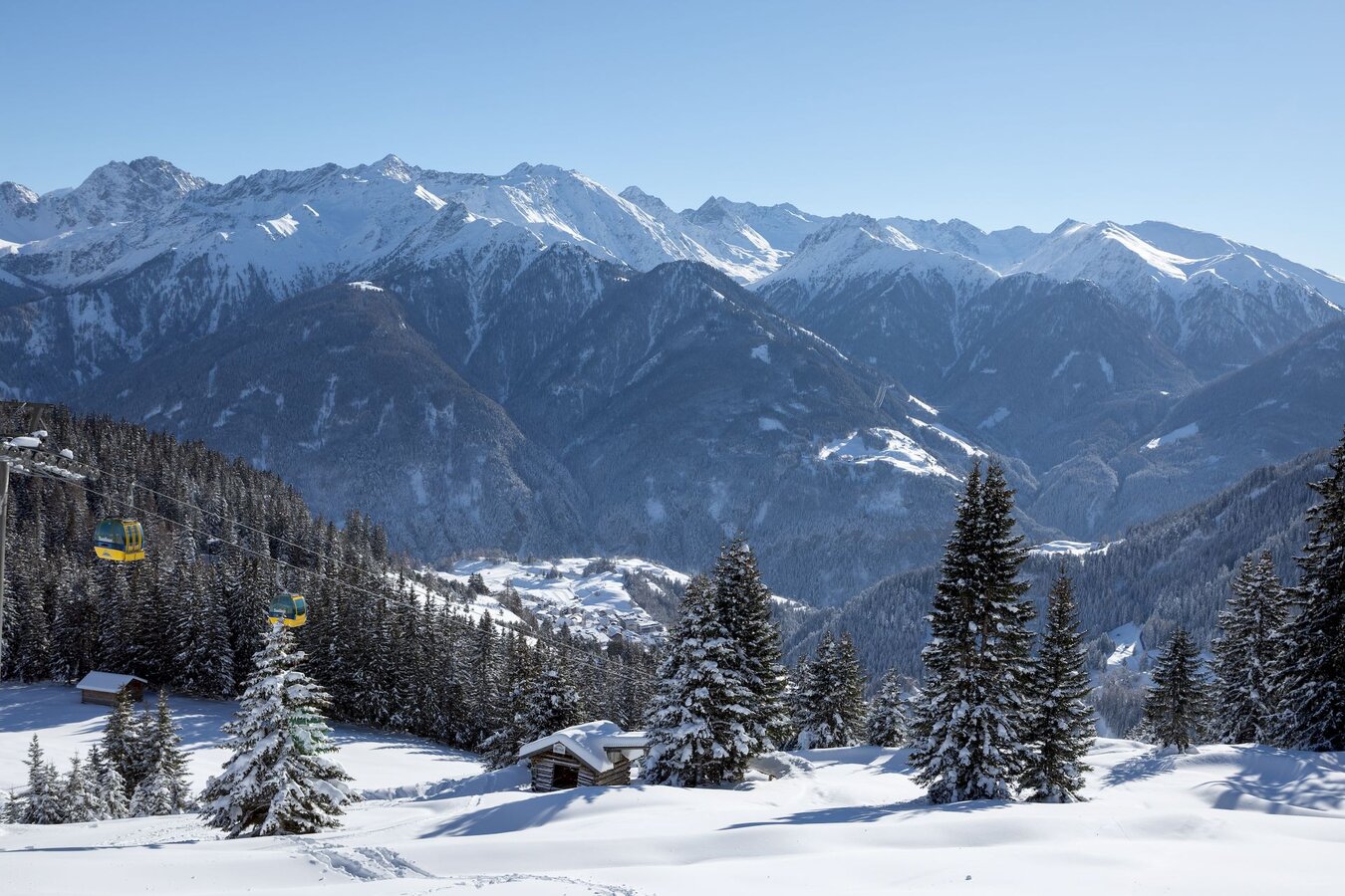 Im Winter sind die HOLZHÜTTEN von einer weißen Schneepracht bedeckt. Während du sitzend mit der Schöngampbahn gipfelwärts fährst, kannst du in der Ferne auf ihre Dächer blicken. Kannst du sie sehen?