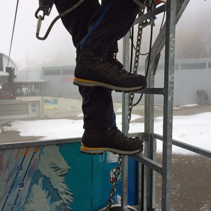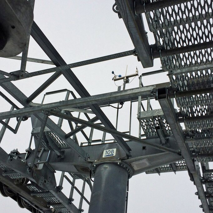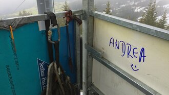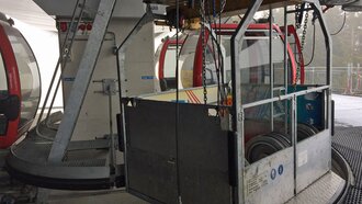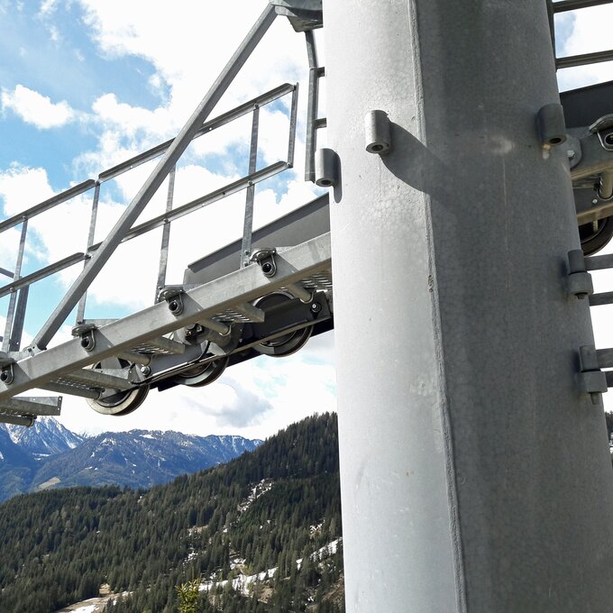 „Bitte einsteigen“ hieß es vom Revisionstrupp der Schönjochbahn, dem ich über die Schultern blicken durfte. Gebi, Andi und Nobs wiesen mir den Weg in den offenen Revisionskorb, der in die Seilbahn eingehängt war. Die „drei Musketiere“ waren ein eingespieltes Team und kletterten, gut gesichert mit einem Klettergurt, sogleich die Leiter hinauf auf den Korb bzw. das Wartungspodest an der Stütze. Der Korb wurde dabei von Christoph von der Mittelstation aus an die jeweilige Stütze navigiert. Wir fuhren mit einer Minimalgeschwindigkeit von 0,3 m/s an die Doppelstütze 10a/10b. Die Maximalgeschwindigkeit einer Gondelbahn beträgt schon etwas mehr: Bis zu 6 Meter pro Sekunde bringen einige Seilbahnen auf den Tacho.