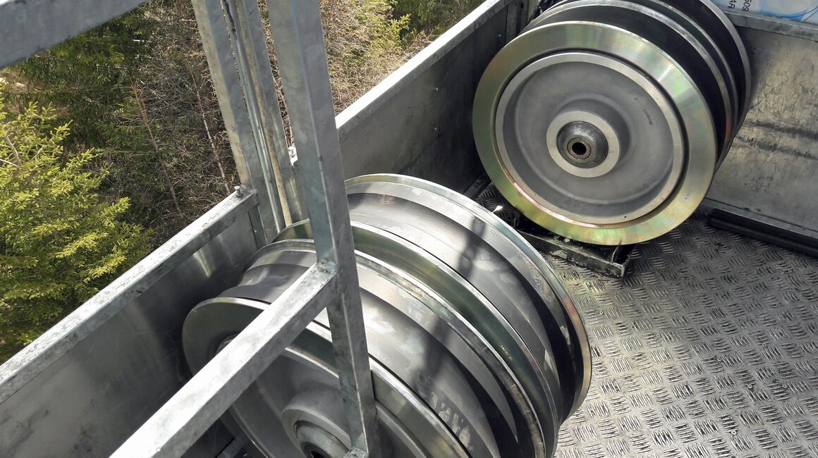 Bei einem stattlichen Gewicht von 50 kg pro Rolle, benötigen die Mitarbeiter mit Sicherheit keine Hanteln mehr. Martin erzählte mir, dass der Gummibelag einer Rolle sich je nach Betriebsstunden, Witterung und Last unterschiedlich abnutzt. Interessanterweise nutzt sich eine Rolle im Sommer stärker ab als im Winter, obwohl die Last geringer ausfällt. Die höheren Temperaturen gehen dem Material an den Leib. Zweimal pro Jahr werden alle Rollen kontrolliert. Ist eine Rolle abgenutzt (vergleichbar mit einem Autoreifen), kann sie direkt vor Ort getauscht werden. Im Revisionskorb führte „mein“ Revisionstrupp einige neue Rollen mit. Mit einer hydraulischen Handpumpe, einem Handkran und einer Seilwinde (Seil eines demontierten Schleppbügels) wurden an der Stütze Nr. 4 die Rollen getauscht.