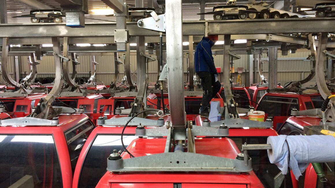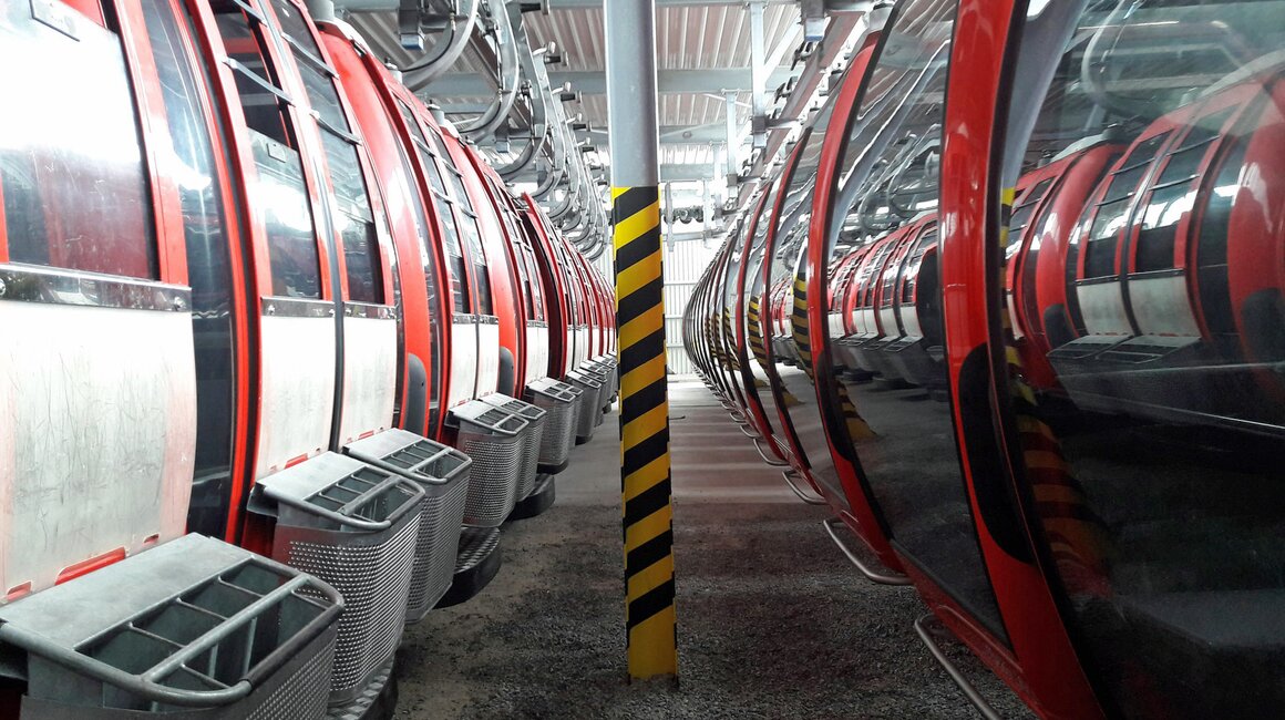 Der Gondelbahnhof an der Mittelstation der Schönjochbahn beherbergt in den Zwischensaisonen 117 rote 8er-Kabinen. Die Möglichkeit durch die Gänge zwischen den Gondelreihen in der Bahnhofshalle zu schlendern, hat man nicht alle Tage. Ich war ganz schön beeindruckt. Zwischen den roten „Schafen“ versteckte sich bei meinem Besuch auch ein schwarzes in der Gondelherde – die elegante Genussgondel. In der luxuriösen Genussgondel können Genießer im Sommer kulinarisch über die Tiroler Wiesen schweben. Ein besonderes gastronomisches Erlebnis, das ich unbedingt einmal ausprobieren möchte. Innerhalb der wenigen Wochen vor Saisonstart müssen auch diese Gondeln unter die Lupe genommen werden.