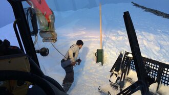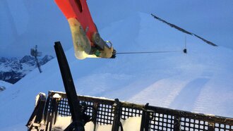 Damit der Senkrechtakt möglich ist, hängt Manuel den Pistenbully oben am Gipfel an einem ANKERPUNKT (Befestigungspunkt) ein. Am Seil hängend klettert der Bully dann mit einer Zugkraft von bis zu 4 TONNEN talwärts. Die Zugkraft kann dabei individuell vom Fahrer geregelt werden. Bei meiner Fahrt fällt mir zudem auf, wie wendig der Kraftkoloss ist. Der Windenaufbau ist nämlich so montiert, dass er sich 360 GRAD drehen kann. Unten angekommen, blicke ich in wenigen Sekunden wieder bergwärts. STARRIG ist der Pistenbully also keinesfalls.