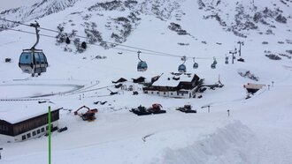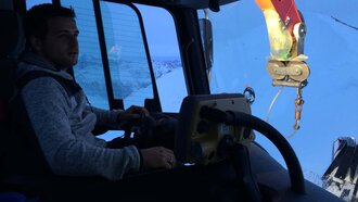 Bei meiner Mitfahrt habe ich Respekt, die langjährige Erfahrung meines Fahrers und der Gurt vermitteln mir jedoch ein Gefühl von Sicherheit. Ich genieße ein GEFÄLLE von bis zu 60% und lasse mich „mutig“ auf diese neue Erfahrung ein. Bergab versuche ich meinen Körper, der ganz schön im Gurt hängt, zurück in den Sitz zu drücken. Mensch und Maschine geraten hier definitiv an ihre Grenzen. Bei der Lazid-Nord-Abfahrt (Pistennummer 125) wird es dann noch steiler: bis zu 76%. Nach nur wenigen Fahrten gewöhne ich mich an die extreme STEILHEIT, als hätte ich nie einen anderen Arbeitsplatz gehabt. Der Blick auf die Schneelandschaft ist atemberaubend. Ich freue mich wie ein kleines Kind und kann langsam VERSTEHEN, was Manuel so fasziniert.