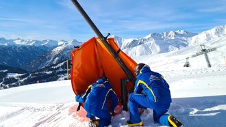 Die Rotorblätter wirbeln reichlich Schnee auf und der Pilot verliert unter Umständen innerhalb weniger Sekunden seine ORIENTIERUNG. Da muss er sich zu 100% auf den Pistenretter verlassen. Zu Beginn war mir schon etwas MULMIG, als der Pilot nur 5 cm vor mir landete“, so Jonas. „Bei der Kommunikation orientieren wir uns an den Uhrzeiten: Vor dem Piloten ist 12 Uhr, links 9 Uhr, rechts 3 Uhr und hinter ihm 6 Uhr. Wenn ich ‚C5 auf 2 Uhr‘ funke, dann weiß er, dass ich rechts vor ihm stehe. Die Anweisungen müssen passen“, fügt Lukas hinzu.