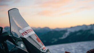 Die Skidoos SCHNURREN, der Zeitplan drängt. Die Pisten sollten vor den ersten Skifahrern kontrolliert sein. Ich nehme hinter Jonas Platz und schon geht es zügig bergwärts. Alles, was auf der Piste steht, wird von ihnen überprüft. Dabei ist ORANGE die Farbe der Stunde. Denn vieles, das auf den Pisten für Sicherheit sorgt, leuchtet in der grellen Farbe: Stangen, Pistenschilder und auch Matten um Lanzen, Schneeerzeuger, Stützen und Heustadel. „Es kann immer etwas passieren. Wir sorgen dafür, dass alle Gefahren möglichst minimiert werden. Bei den Kontrollfahrten richten wir die STANGEN am Pistenrand gerade. Bei Schlechtwetter sorgen sie für einen gut gekennzeichneten Pistenrand. Beschädigte Stangen werden ausgetauscht. Bei der Frommesabfahrt sind es insgesamt 650. Mit über 7 km ist sie die längste Abfahrt im Skigebiet. Bei den MATTEN schauen wir, dass die Öffnung immer auf der gegenüberliegenden Seite eines möglichen Aufpralls liegt“, erklärt mir Jonas.