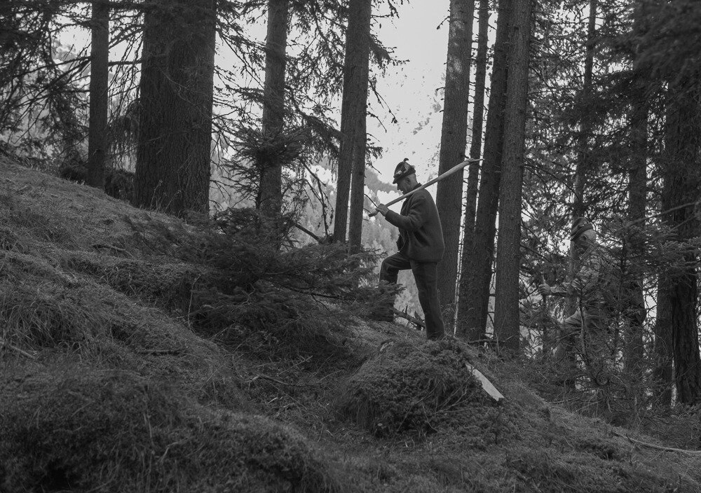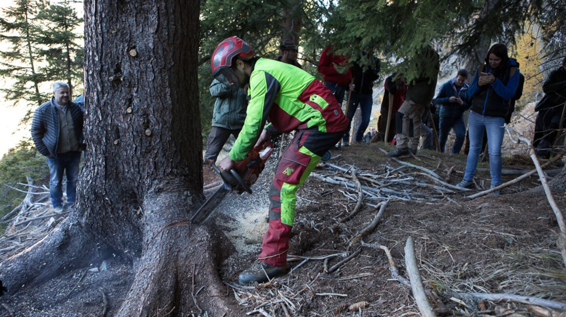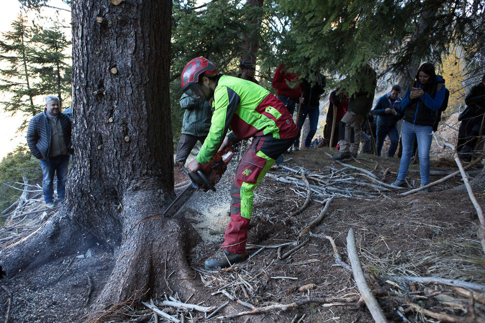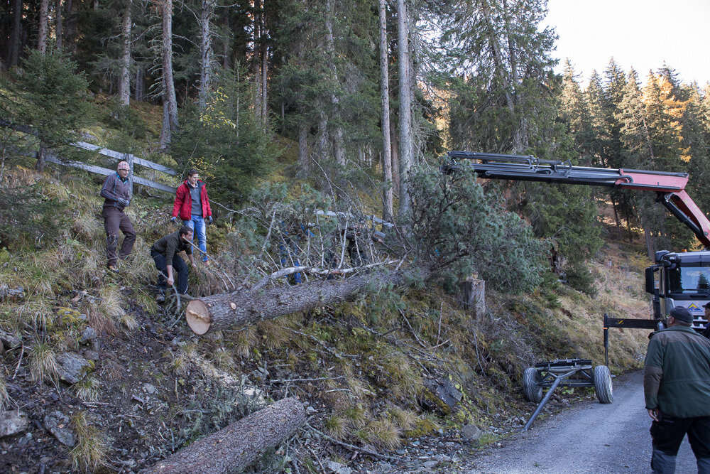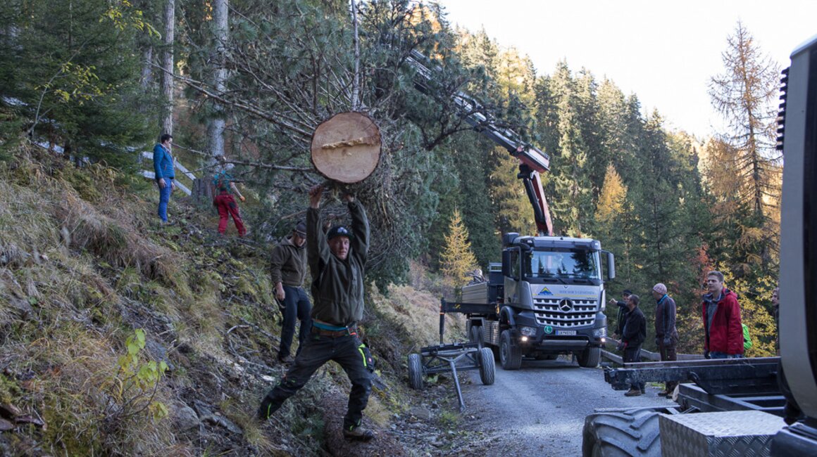 Schlag 13.30 Uhr ist es dann so weit und jetzt wird es für alle so richtig ernst. Der Umzug mit der 35 Metern lagen Zirbe startet durch Fiss. Jetzt gilt es: Alles muss wie im Training funktionieren, muss Hand in Hand gehen. Die aufgestaute Anspannung und das Adrenalin entladen sich bei den Teilnehmern. Alle spielen ihre Rollen.