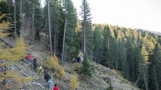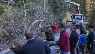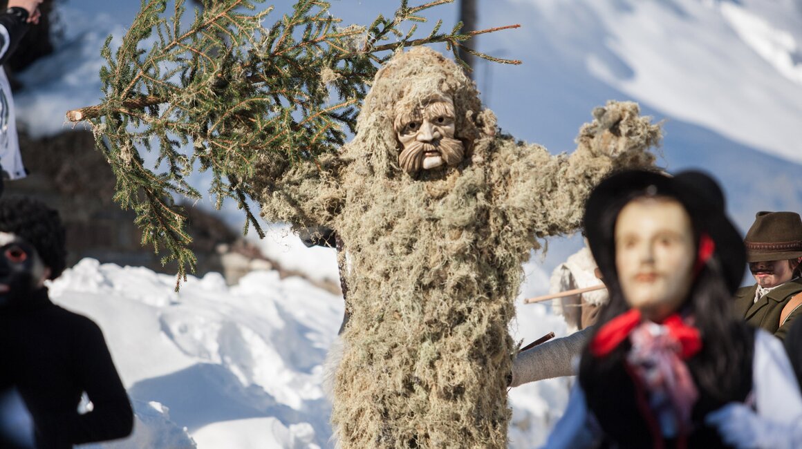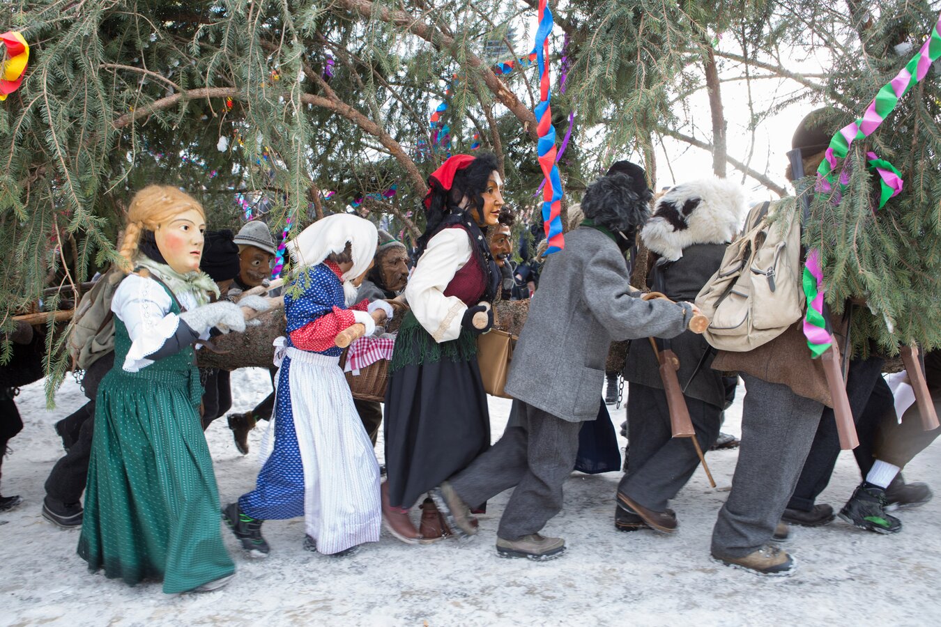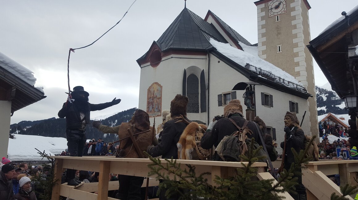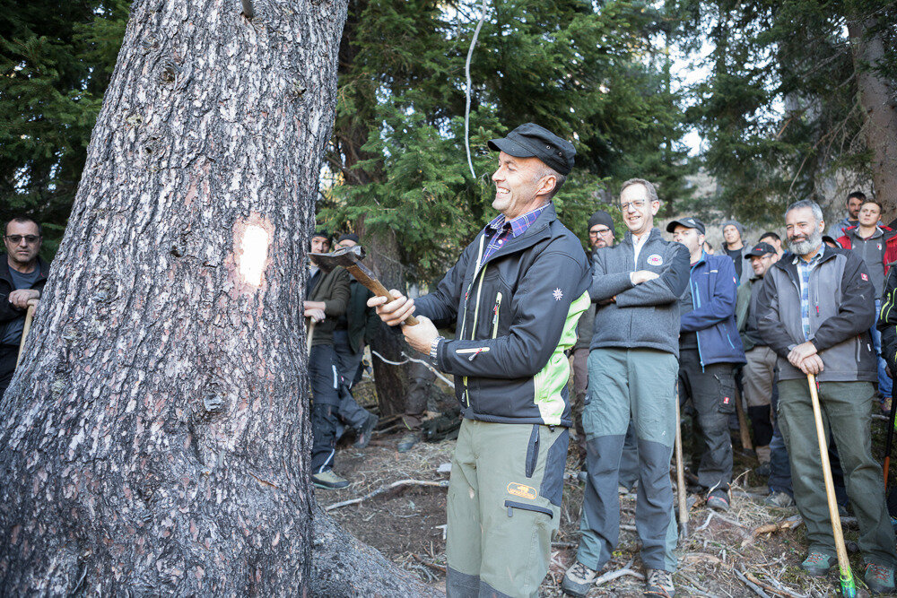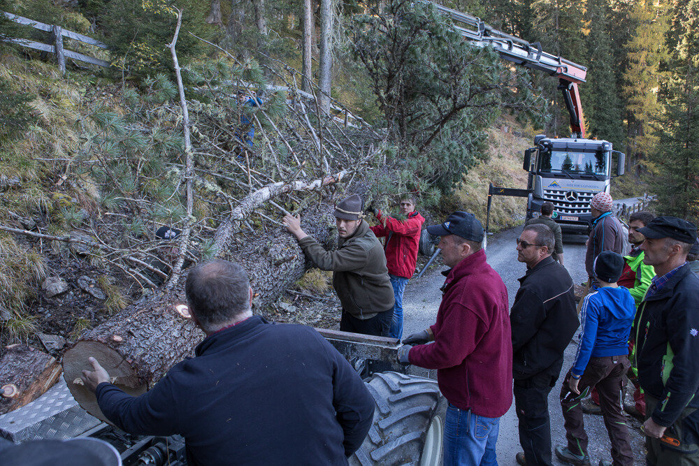 Markus: Rund 40 Fisser Männer gehen an einem Tag im Oktober in den Wald um den Blochbaum, einen mächtigen Zirbenstamm, zu holen. Dieser wird vom Waldaufseher ausgesucht und spendiert. Ein Mitarbeiter der Agrargemeinschaft schneidet den Baum schlussendlich um. Dann wird er in zwei Teile zerlegt und ins Dorf transportiert. Der erste Teil auf einem LKW und der zweite Teil des Baumes wird mit einem Traktor ins Dorf gezogen. Gelenkt wird der Stamm von Hand. Dafür braucht es immer mindestens vier Männer.