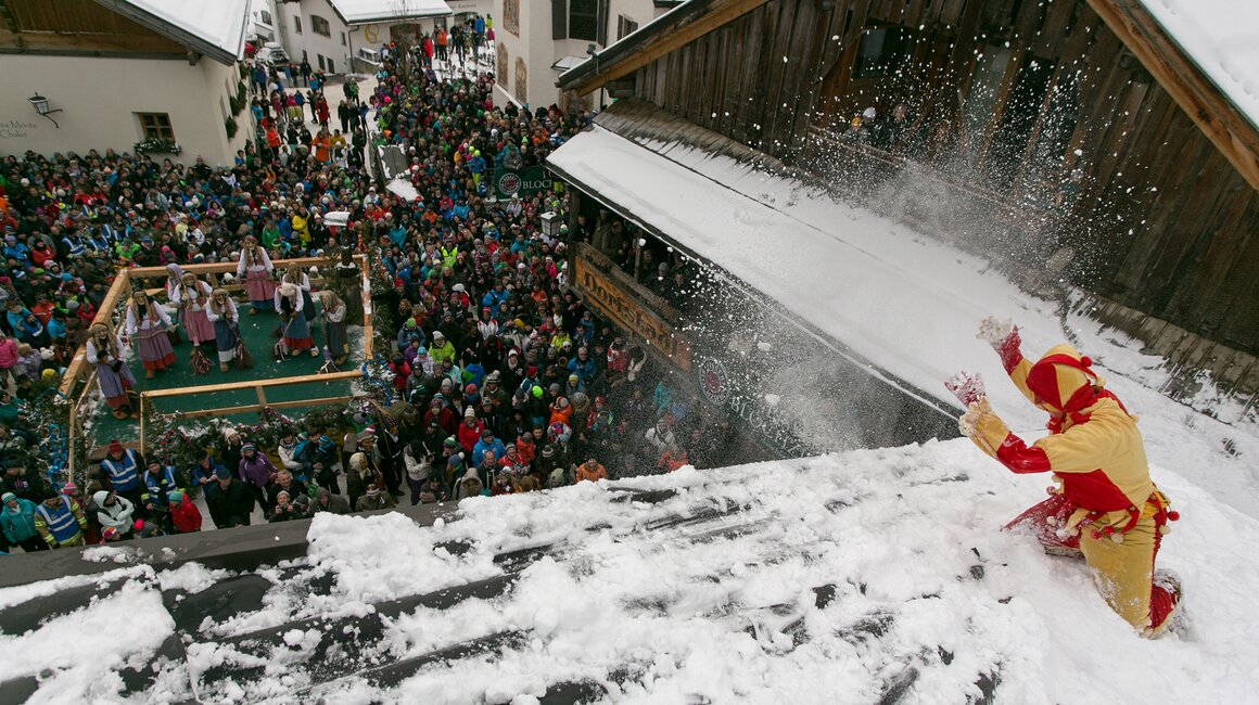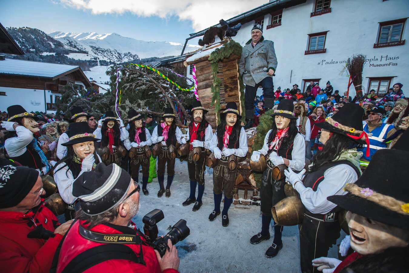 Die Fisser Straßen sind gesäumt mit Menschenmassen – alle sind gekommen um unser Brauchtum zu erleben. Gäste aus nah und fern, zahlreiche Einheimische und auch viel Prominenz aus Wirtschaft und Politik ist vor Ort. Ich musste das Kostüm und die Maske an einen „geheimen“ Ort bringen – keine einfache Herausforderung. Noch schwieriger ist das Anziehen. Alleine ist das gar nicht möglich. Hier brauche ich einige Helfer.